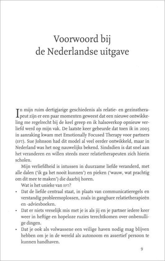 Wilt u een goede relatie verdiepen, een uitgedoofde relatie nieuw leven inblazen of een relatie die verkeerd dreigt te gaan redden? We zijn allemaal op zoek naar liefde, steun en verbondenheid, maar soms hebben we daar een beetje hulp bij nodig. Die hulp komt van dr. Sue Johnson, ontwikkelaar van Emotionally Focused Couple Therapy en ‘de beste relatietherapeut ter wereld’, aldus bestsellerauteur en relatie-expert dr. John Gottman.