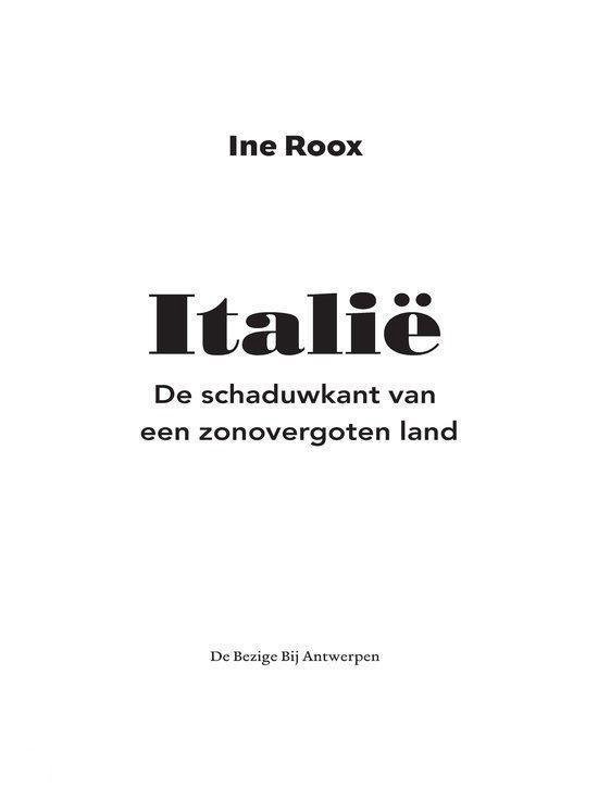 In Italië. De schaduwkant van een zonovergoten land reist Ine Roox door dat andere Italië en verwerpt zij niet zozeer alle clichés, maar belicht ze van een andere kant of schenkt ze diepgang. Aan de hand van vijftien verhalen – over onder meer politiek, religie, gastronomie, emigratie en cultuur – schetst Ine Roox op meeslepende wijze een genuanceerd en rijkgeschakeerd beeld van een land dat het verdient om beter gekend te worden.