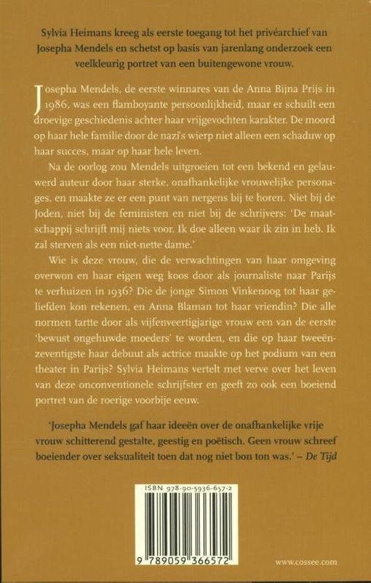 Josepha Mendels groeide aan het begin van de twintigste eeuw op in een orthodox-joods milieu, maar kon daar moeilijk aarden. Ze begon te schrijven naast haar werk als gouvernante, en vertrok op vierendertigjarige leeftijd naar Parijs, om het benauwde Nederland achter zich te laten. Na de Tweede Wereldoorlog zou ze een gevierd auteur worden, bekroond maar ook verguisd. Mendels is een flamboyante persoonlijkheid, maar er schuilt ook een diepe, droevige geschiedenis achter haar vrijgevochten karakter. De moord op haar hele familie door de nazi’s wierp niet alleen een schaduw op haar succes, maar op haar hele leven. Zeker is dat ze los is gekomen van haar orthodoxe jeugd. Na de oorlog was de jonge Simon Vinkenoog haar minnaar en Anna Blaman haar vriendin. Ze werd een bekend en gelauwerd auteur door haar sterke, onafhankelijke vrouwelijke personages, en maakte er een punt van nergens bij te horen. Niet bij de joden, niet bij de feministen en niet bij de schrijvers: ‘De maatschappij schrijft mij niets voor. Ik doe alleen waar ik zin in heb. Ik zal sterven als een niet-nette dame.’ Wie is deze vrouw, die de verwachtingen van haar omgeving overwon en haar eigen weg koos? Die alle normen tartte door als vijfenveertigjarige vrouw een van de eerste ‘bewust ongehuwde moeders’ te worden, en die op haar tweeënzeventigste haar debuut als actrice maakte en schaars gekleed op het podium van een theater in Parijs stond? Sylvia Heimans maakt de winst- en verliesrekening op van het leven van een eigenzinnige en onconventionele schrijfster, die haar omgekomen familie op het toneel van de grote literatuur wist te brengen, en het liefst had gewild dat haar familieleden getuige konden zijn van haar succes.