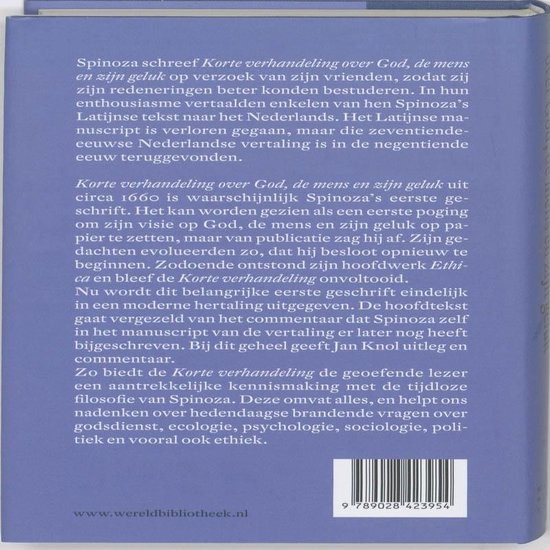 Nu wordt dit belangrijke eerste geschrift eindelijk in een moderne hertaling uitgegeven. De hoofdtekst gaat vergezeld van het commentaar dat Spinoza zelf in het manuscript van de vertaling er later nog heeft bijgeschreven. Bij dit geheel geeft Jan Knol uitleg en commentaar.