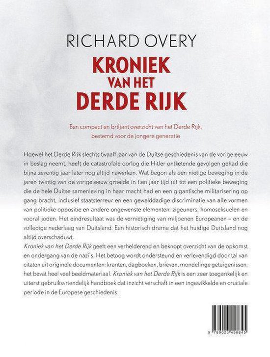 Kroniek van het Derde Rijk geeft een verhelderend en beknopt overzicht van de opkomst en ondergang van de nazi s. Het betoog wordt ondersteund en verlevendigd door tal van citaten uit originele documenten: kranten, dagboeken, brieven, mondelinge getuigenissen; het bevat heel veel beeldmateriaal. Kroniek van het Derde Rijk is een zeer toegankelijk en uiterst gebruiksvriendelijk handboek dat inzicht verschaft in een ingewikkelde en cruciale periode in de Europese geschiedenis.