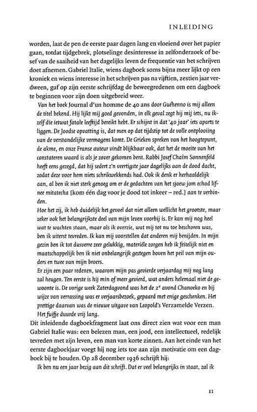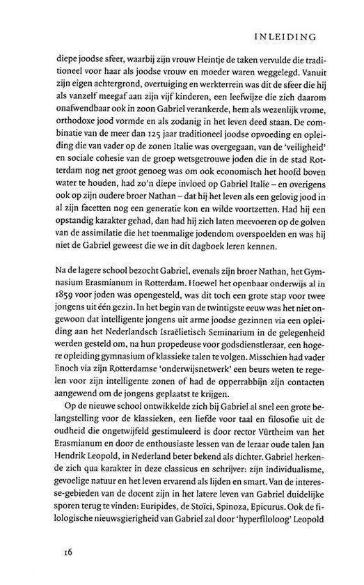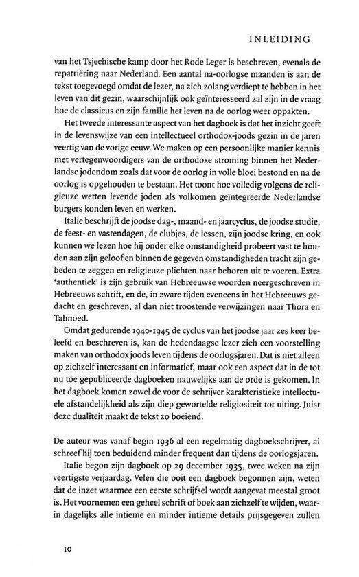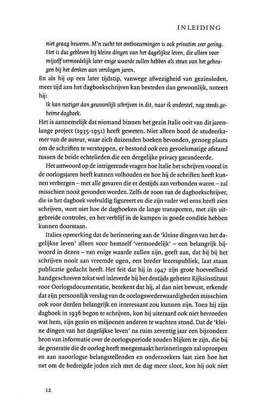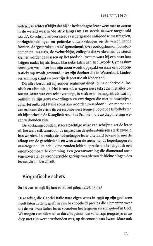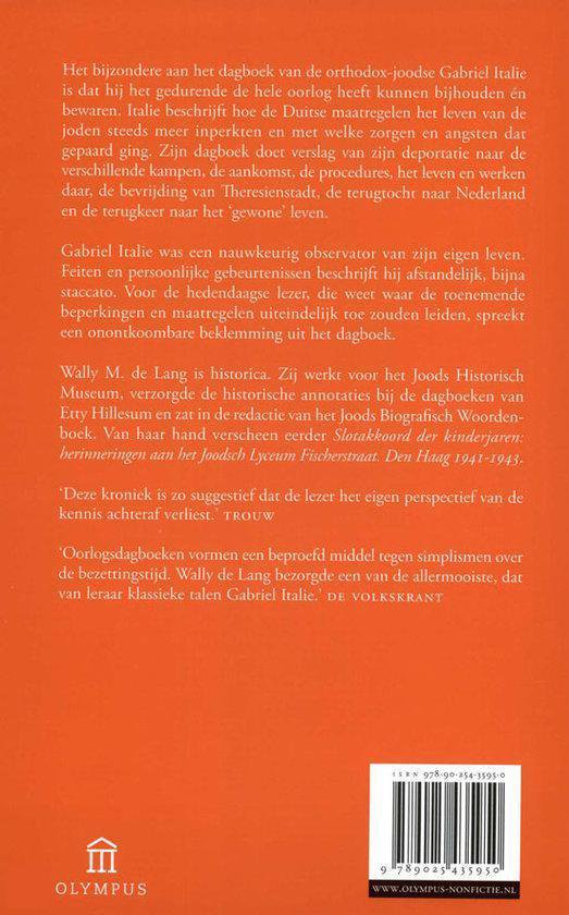 Beschrijving Dat er bijna 65 jaar na de Tweede Wereldoorlog nog steeds nieuwe dagboeken worden ontdekt is op zich al interessant, maar het bijzondere in het geval van de orthodox-joods Gabriel Italie is dat hij gedurende de hele oorlog een dagboek heeft kunnen bijhouden én bewaren. Hij begon zijn dagboek al in 1935 toen hij als docent Klassieke Talen op het Maerlant Lyceum in Den Haag werkte en bleef schrijven toen de oorlog uitbrak en hij met vrouw en kinderen in Barneveld, Westerbork en Theresienstadt terechtkwam. Een zo uitgebreide geschiedenis is niet vaak te boek gesteld om de eenvoudige reden dat de meeste gedeporteerden niet terugkwamen en met hen ook hun aantekeningen verdwenen. Italie beschrijft hoe de Duitse maatregelen het leven van de joden steeds meer inperkten en met welke zorgen en angsten dat gepaard ging. Zijn dagboek bevat de directe weergave van de deportatie naar de verschillende kampen, de aankomst, de procedures, het leven en werken aldaar, de bevrijding van Theresienstadt, de terugtocht naar Nederland en het oppakken van het ‘gewone’ leven. Gabriel Italie was een nauwkeurig observator van zijn eigen leven. Feiten en persoonlijke gebeurtenissen beschrijft hij op bijna staccato-achtige wijze: afstandelijk, onderkoeld, in een soms bijna cynische woordkeus. De keren dat hij zich emotioneel uit, bijvoorbeeld over het verlies van zijn zoon, komen des te harder aan. Omdat de hedendaagse lezer weet waar de toenemende beperkingen en maatregelen uiteindelijk toe zouden leiden, spreekt uit het dagboek een onontkoombare beklemming. Recensie(s) NBD|Biblion recensie Het oorlogsdagboek van Gabriel Italie (1895-1956), een orthodox-joodse leraar klassieke talen uit Den Haag, geeft zeer uitvoerig en gedetailleerd gebeurtenissen en ervaringen weer uit 1940-1945. De sobere, expressieve, vaak ironische dagboekaantekeningen geven een bijzondere inkijk in de wijze waarop het tragische nieuws van de wereldoorlog binnenkomt in een gezin waarvan de bestaansbasis in toenemende mate wordt bedreigd. Dat Italie het schrijven volhield en zijn dagboeken kon bewaren, mag een wonder heten. Hij werd ontslagen, kwam via kamp Barneveld in Westerbork terecht en uiteindelijk in Theresienstadt dat in mei 1945 werd bevrijd; hij verloor een zoon. Bijna elke dag noteerde hij nauwgezet feiten, meningen en stemming rond o.m. de vele anti-joodse maatregelen, berichten over fronten in en buiten Europa, afgelegde bezoeken, al dan niet loze geruchten, rantsoenering. En dan de transporten, het leven in de kampen, ziekte en dood, de kritieke gezondheidssituatie van bekenden en gezinsleden. Het laatste stuk schildert het kampleven. Indringende lectuur voor geinteresseerden in de Tweede Wereldoorlog. Met enkele zwart-witfoto’s en een register. (NBD|Biblion recensie, Dr. J.L.G. v. Oudheusden)