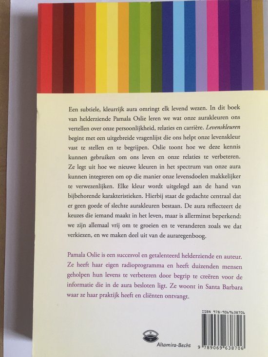 Een subtiele, kleurrijke aura omringt elk levend wezen. In dit boek van helderziende Pamala Oslie leren we wat onze aurakleuren ons vertellen over onze persoonlijkheid, relaties en carrière. Levenskleuren begint met een uitgebreide vragenlijst die ons helpt onze levenskleur vast te stellen en te begrijpen. Oslie toont hoe we deze kennis kunnen gebruiken om ons leven en onze relaties te verbeteren. Ze legt uit hoe we nieuwe kleuren in het spectrum van onze aura kunnen integreren om op die manier onze levensdoelen makkelijker te verwezenlijken. Elke kleur wordt uitgelegd aan de hand van bijbehorende karakteristieken. Hierbij staat de gedachte centraal dat er geen goede of slechte aurakleuren bestaan. De aura reflecteert de keuzen die iemand maakt in het leven, maar is allerminst beperkend: we zijn allemaal vrij om te groeien en te veranderen zoals we dat verkiezen, en we maken deel uit van de auraregenboog. Pamala Oslie is een succesvol en getalenteerd helderziende en auteur. Ze heeft haar eigen radioprogramma en heeft duizenden mensen geholpen hun levens te verbeteren door begrip te creëren voor de informatie die in de aura besloten ligt. Ze woont in Santa Barbara, waar ze haar praktijk heeft en cliënten ontvangt.