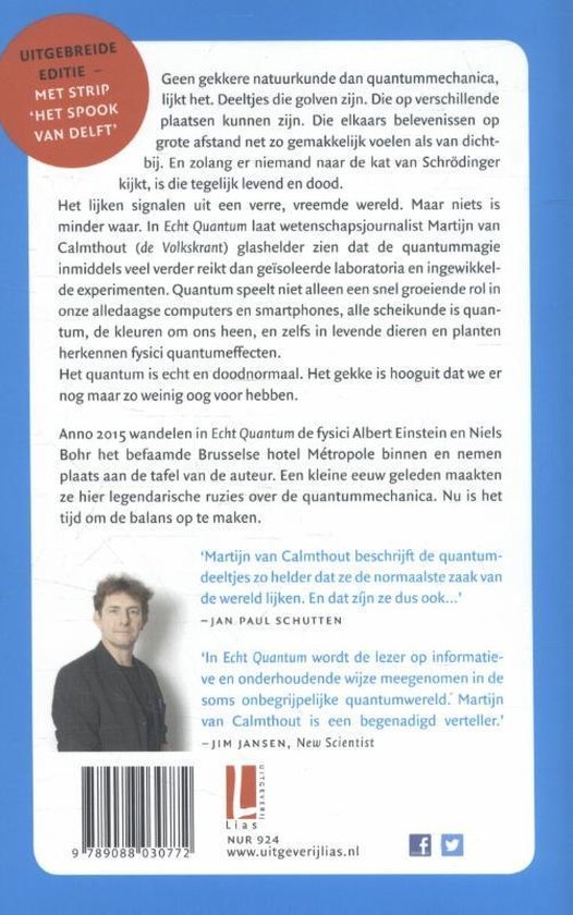 In de deeltjeswereld gelden heel andere wetten dan in de wereld van alledag. Zo anders, dat natuurkundigen lang hebben gedacht dat de quantumwereld nooit tot de alledaagse wereld zou doordringen. Maar dat blijkt toch niet waar. Steeds meer gadgets maken gebruik van quantumeffecten, waarvan een eeuw geleden werd gedacht dat ze hooguit in het laboratorium van belang konden zijn. En hoe wonderbaarlijk het nu al lijkt, het wordt allemaal nog veel opzienbarender. Telecommunicatie, rekenen, informatieverwerking, niets zal nog lang hetzelfde blijven. Deels is dat een kwestie van steeds handiger techniek. Maar de wetten van de deeltjeswereld blijken ook veel robuuster dan gedacht. Niet alleen deeltjes vertonen quantumgedrag; ook grotere objecten kunnen zich volgens de vreemde wetten van Niels Bohr, Werner Heisenberg en de andere quantumpioniers gedragen. Dát het kan, is duidelijk. De quantumwereld is in onze broekzak beland. Hóe dat kan is een raadsel waarover fysici en filosofen zich het hoofd breken. In ‘Echt quantum’ draait het om de vraag hoe een esoterische theorie van een handvol geniale geleerden uiteindelijk de hele wereld op zijn kop kon zetten. Waarom is de quantumtheorie zo anders dan alles wat we kennen? Maar ook: waarom blijkt hij gaandeweg veel bruikbaarder dan gedacht. En wat zegt dat over de wereld waarin we leven? Is dat niet een quantumwereld geworden? Op enthousiaste en heldere wijze wordt de quantumtheorie door Martijn van Calmthout verklaard en het boek bevat speelse, filosofische dialogen met natuurkundigen Leo Kouwenhoven en Dirk Bouwmeester. Hoe pak je een elektron? Wat is eigenlijk klein? Kun je denken als deeltje? Schiet de natuurkunde iets op met filosofen? Leo Kouwenhoven, winnaar Spinozaprijs, schreef het voorwoord. Martijn van Calmthout is journalist bij de Volkskrant, Einstein-kenner en gek op wetenschap; van oermensen tot ruimtevaart, van hersens tot vogelzwermen, van de kleinste deeltjes tot 3D-printers. Hij schrijft dagelijks voor de krant, blogt en twittert, presenteert live-wetenschapsshows, waaronder Het maandelijkse KennisCafé in De Balie, en het radioprogramma De kennis van nu. Eerder schreef hij ‘Survivalgids voor de toekomst'( `Uitstekende wetenschapsjournalistiek’, NRC) en, samen met Jelle Reumer, ‘Nobel op de kaart. Op zoek naar de Nederlandse Nobelprijswinnaars van vroeger en nu’ (`Een eerbetoon aan al die onbekende Nobelprijswinnaars’, de Volkskrant)