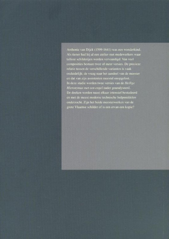 In deze studie worden twee versies van ‘De Heilige Hieronymus met een Engel’ van Anthonie van Dijck (1599-1641)nader geanalyseerd. De doeken werden naast elkaar intensief bestudeerd en met de meest moderne technische hulpmiddelen onderzocht. Zijn het beide meesterwerken van de grote Vlaamse schilder of is een ervan een kopie?