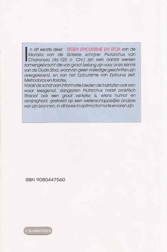 In de Maior-serie wordt het verzamelde werk van de Griekse schrijver Plutarchus (46-120 n.C.) uitgegeven, bestaande uit Moralia en Biografieën. Dit eerste deel van de Moralia bevat geschriften die gericht zijn tegen de Stoa en het Epicurisme. Het werk biedt een schat aan informatie over Stoa en Epicurisme en geeft vele citaten uit verloren werken van o.a. Epicurus, Chrysippos, Zeno en andere filosofen. Plutarchus is naast een praktisch filosoof ook een goede verteller en literator, wiens humor en venijnigheid, gestoeld op een wetenschappelijke analyse van zijn bronnen, in optima forma in dit werk te ervaren zijn. Inhoud: *Verdediging van de filosofen tegen Kolotes *Het is zelfs niet mogelijk aangenaam te leven volgens Epicurus *Tegenstrijdigheden bij de Stoa *Of de stelling: “Leef onopgemerkt!” juist is *Algemene begrippen en de Stoa *Beknopte behandeling van de stelling: ‘De Stoïci praten in nog grotere paradoxen dan de dichters.’