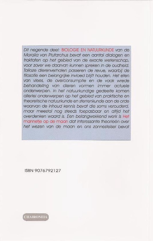 Dit negende deel: BIOLOGIE EN NATUURKUNDE van de Moralia van Plutarchus van Chaironeia bevat een aantal dialogen en traktaten op het gebied van de exacte wetenschap, voor zover we daarvan kunnen spreken in de oudheid. Talloze dierenverhalen passeren de revue, waarbij de filosofie een belangrijke invloed blijft houden. Het eten van vlees, de overconsumptie en de vaak wrede behandeling van dieren vormen immer actuele onderwerpen. In het natuurkundige gedeelte passeren allerlei onderwerpen op het gebied van praktische en theoretische natuurkunde en sterrenkunde de revue waarvan de inhoud kennis bevat die soms verouderd, maar meestal nog steeds toepasbaar en altijd het overdenken waard is. Een belangwekkend werk is Het mannetje op de maan dat interessante theorieën over het wezen van de maan en ons zonnestelsel bevat. Inhoud: * Symposion van de 7 Wijzen * Wie zijn slimmer, land- of waterdieren * Dieren hebben verstand * Het eten van vlees I en II * Het mannetje op de maan * achtergronden van natuurlijke verschijnselen * Koude als primair element * Wat is nuttiger, water of vuur?