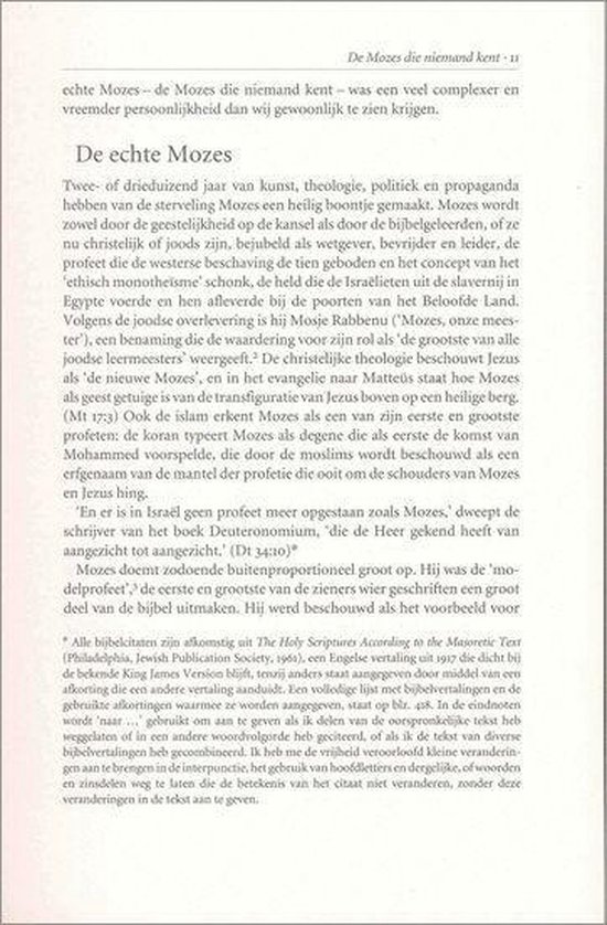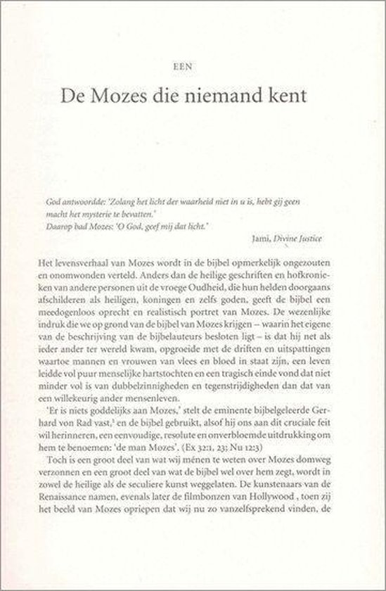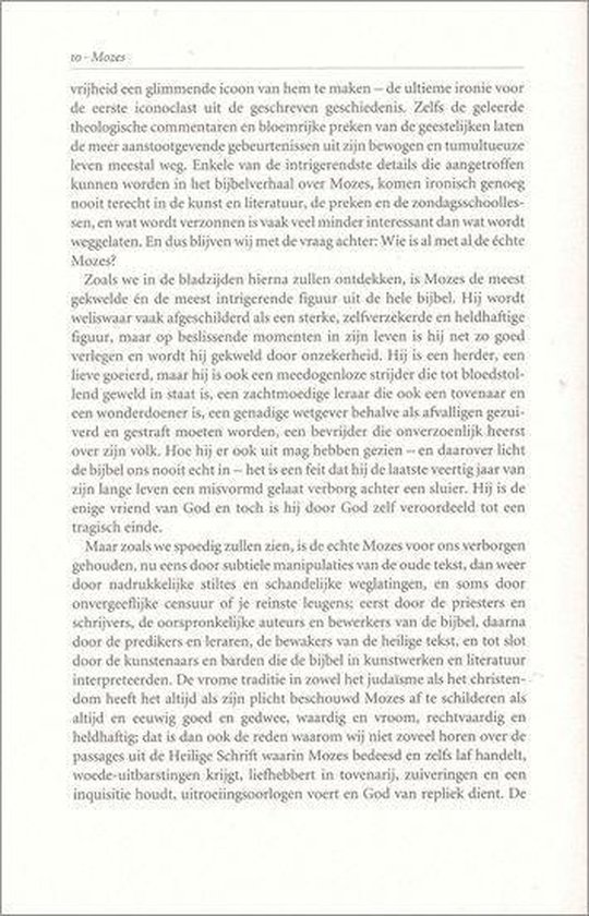 Mozes, wetgever en bevrijder, ziener en profeet, is volgens Jonathan Kirsch de indrukwekkendste figuur uit het Oude Testament. Hij is de enige mens die met God mocht spreken ‘van aangezicht tot aangezicht, gelijk een man met zijn vriend spreekt’. Maar zoals Kirsch in zijn indrukwekkende monografie aantoont, was Gods oogappel ook een ondoorgrondelijke en mysterieuze figuur met vele eigenschappen: goede herder, meedogenloos krijger, geestelijk leider, magiër en wetgever. De Mozes van Jonathan Kirsch heeft opvallend moderne trekken, die sterk afwijken van het stereotiepe beeld dat velen van hem hebben.