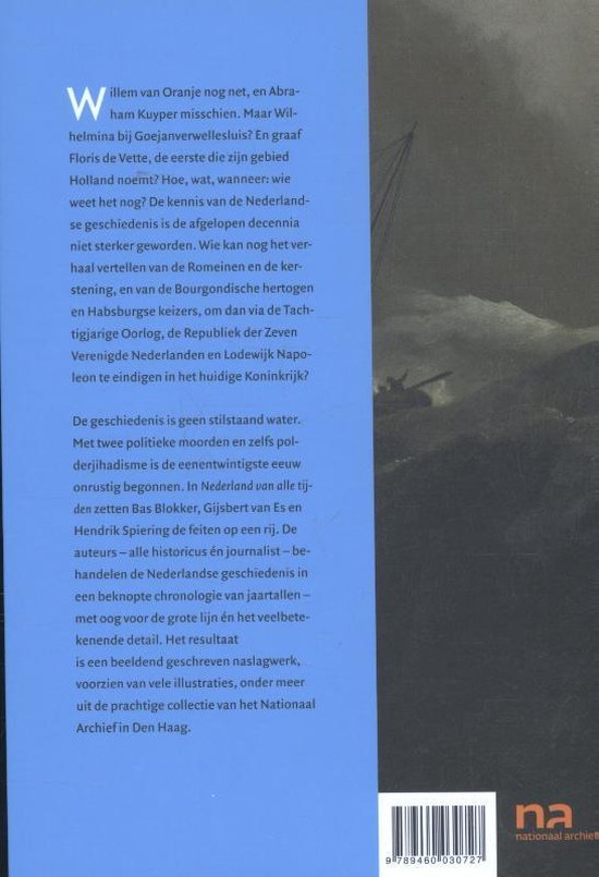 De geschiedenis is geen stilstaand water. Met een nieuwe koning (en koningin), twee politieke moorden en een nieuw fenomeen als het polderjihadisme is de eenentwintigste eeuw onrustig begonnen. In Nederland van alle tijden zetten Bas Blokker, Gijsbert van Es en Hendrik Spiering de feiten op een rij. De auteurs – alle historicus én journalist – behandelen de Nederlandse geschiedenis in een beknopte chronologie van jaartallen – met oog voor de grote lijn én het veelbetekenende detail. Het resultaat is een beeldend geschreven naslagwerk, voorzien van vele illustraties, onder meer uit de prachtige collectie van het Nationaal Archief in Den Haag.