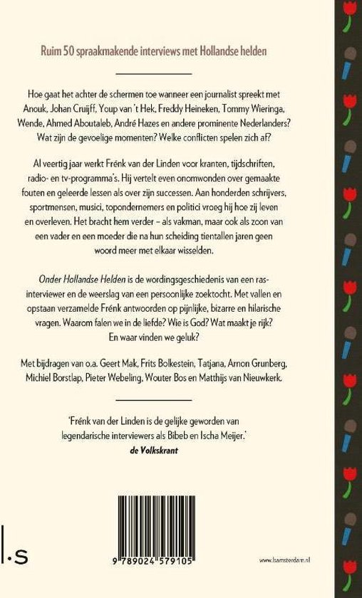 Hoe gaat het achter de schermen toe wanneer een journalist spreekt met Anouk, Johan Cruijff, Youp van ’t Hek, Freddy Heineken, Tommy Wieringa, Wende, Ahmed Aboutaleb, André Hazes en andere prominente Nederlanders? Wat zijn de gevoelige momenten? Welke conflicten spelen zich af? Al veertig jaar werkt Frénk van der Linden voor kranten, tijdschriften, radio- en tv-programma’s. Hij vertelt even onomwonden over gemaakte fouten en geleerde lessen als over zijn successen. Aan honderden schrijvers, sportmensen, musici, topondernemers en politici vroeg hij hoe zij leven en overleven. Het bracht hem verder – als vakman, maar ook als zoon van een vader en een moeder die na hun scheiding tientallen jaren geen woord meer met elkaar wisselden. Onder Hollandse Helden is de wordingsgeschiedenis van een rasinterviewer en de weerslag van een persoonlijke zoektocht. Met vallen en opstaan verzamelde Frénk antwoorden op pijnlijke, bizarre en hilarische vragen. Waarom falen we in de liefde? Wie is God? Wat maakt je rijk? En waar vinden we geluk? Met bijdragen van onder andere Geert Mak, Frits Bolkestein, Tatjana, Arnon Grunberg, Michiel Borstlap, Pieter Webeling, Wouter Bos en Matthijs van Nieuwkerk. ‘Frénk van der Linden is de gelijke geworden van legendarische interviewers als Bibeb en Ischa Meijer.’ de Volkskrant