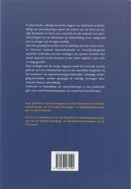 Deze nieuwe uitgave van Onderzoek en behandeling van spierverkortingen bevat een volledig herziene versie wat betreft de biomechanische en neurofysiologische aspecten verbonden aan het verlengen van spieren. Deze werd aangepast aan de meest recente inzichten aangaande het gebruik van verlengingstechnieken. Naar analogie met de vorige uitgave wordt het principe van oriënterende en specifieke lengtetest voor de meeste spieren behouden. Daarnaast is er bijkomend meer aandacht besteed aan het gebruik van dwarse rek. Het boek blijft vooral een praktische gids voor studenten, kinesitherapeuten en andere geïnteresseerden uit het sportmilieu.