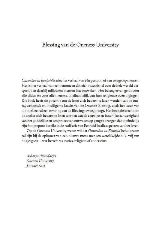 Ontwaken in Eenheid: De kracht van de Blessing in de evolutie van ons Bewustzijn vertelt het opmerkelijke verhaal van deze radicale nieuwe weg naar persoonlijke en mondiale transformatie. Arjuna Ardagh doet op een onafhankelijke wijze verslag van de effecten van de Oneness Blessings op levens van mensen overal ter wereld. Ook in Nederland voelen velen zich aangetrokken tot de visie van de Oneness University.