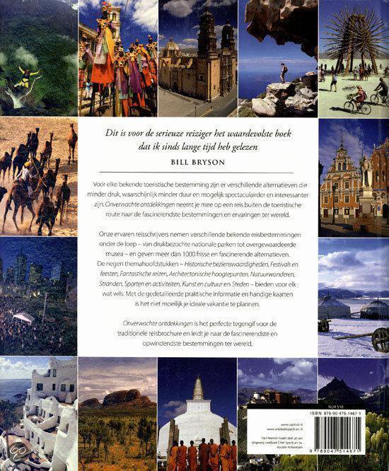 Voor elke bekende toeristische bestemming zijn er verschillende alternatieven die minder druk, waarschijnlijk minder duur en mogelijk spectaculairder en interessanter zijn. Onverwachte ontdekkingen neemt je mee op een reis buiten de toeristische route naar de fascinerendste bestemmingen en ervaringen ter wereld. Onze ervaren reisschrijvers nemen verschillende bekende reisbestemmingen onder de loep – van drukbezochte nationale parken tot overgewaardeerde musea – en geven meer dan 1000 frisse en fascinerende alternatieven. De negen themahoofdstukken – Historische bezienswaardigheden, Festivals en feesten, Fantastische reizen, Architectonische hoogtepunten, Natuurwonderen, Stranden, Sporten en activiteiten, Kunst en cultuur en Steden – bieden voor elk wat wils. Met de gedetailleerde praktische informatie en handige kaarten is het niet moeilijk je ideale vakantie te plannen. Onverwachte ontdekkingen is het perfecte tegengif voor de traditionele reisbrochure en leidt je naar de fascinerendste en opwindendste bestemmingen ter wereld.