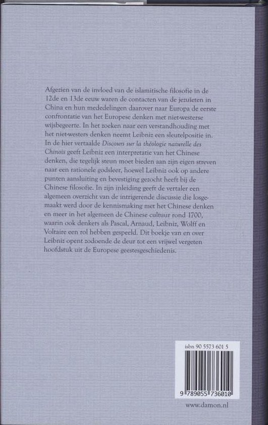 Afgezien van de invloed van de Islamitische filosofie in de 12de en 13de eeuw waren de contacten van de Jezuïeten in China en hun mededelingen daarvan naar Europa de eerste confrontatie van het Europese denken met Niet-westerse wijsbegeerte. In het zoeken naar een verstandhouding tot het Niet-westers denken neemt Leibniz een sleutelpositie in. In de hier vertaalde Discours sur la théologie naturelle des Chinois geeft Leibniz een interpretatie van het Chinese denken, die tegelijk steun moet bieden aan zijn eigen streven naar een rationele godsleer, hoewel Leibniz ook op andere punten aansluiting en bevestiging gezocht heeft bij de Chinese filosofie. In zijn inleiding geeft de vertaler een algemeen overzicht van de intrigerende discussie die losgemaakt werd door de ontvankelijke receptie van het Chinese denken en meer in het algemeen de Chinese cultuur rond 1700, waarin ook denkers als Pascal, Arnaud, Leibniz, Wolff en Voltaire een rol hebben gespeeld. Dit boekje van en over Leibniz opent zodoende de deur tot een vrijwel vergeten hoofdstuk uit de Europese geestesgeschiedenis.