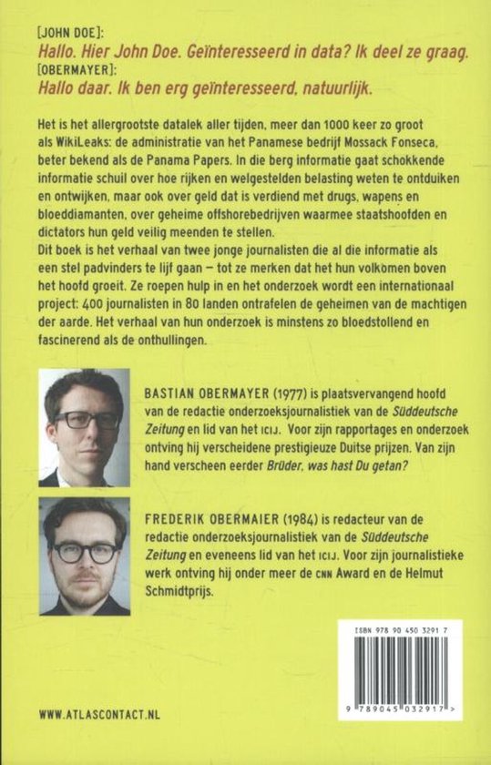 In ‘Panama papers’ beschrijven Bastian Obermayer en Frederik Obermaier het allergrootste datalek aller tijden, meer dan 1000 keer zo groot als WikiLeaks: de administratie van het Panamese bedrijf Mossack Fonseca, beter bekend als de Panama Papers. In die berg informatie gaat schokkende informatie schuil over hoe rijken en welgestelden belasting weten te ontduiken en ontwijken, maar ook over geld dat is verdiend met drugs, wapens en bloeddiamanten, over geheime offshore bedrijven waarmee staatshoofden en dictators hun geld veilig meenden te stellen. Dit boek is het verhaal van twee jonge journalisten die al die informatie als een stel padvinders te lijf gaan – tot ze merken dat het hun volkomen boven het hoofd groeit. Ze roepen hulp in en het onderzoek wordt een internationaal project: 400 journalisten in 80 landen ontrafelen de geheimen van de machtigen der aarde. Het verhaal van hun onderzoek is minstens zo bloedstollend en fascinerend als de onthullingen.