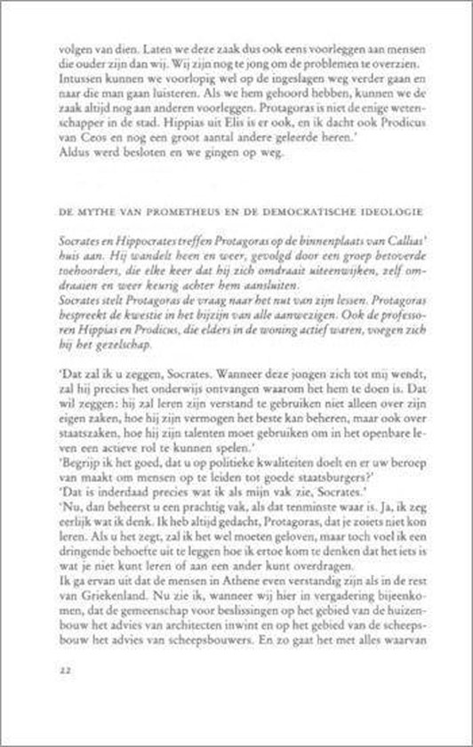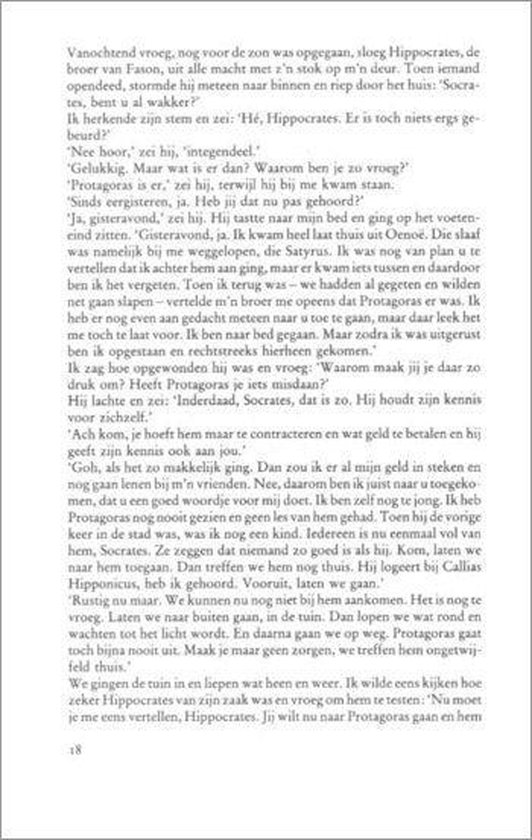Plato, schrijvér begint in de ochtendschemering, aan het bed van Plato’s ironische en demonische leraar Socrates en eindigt diep in, de nacht met de beklemmende vergadering van de autoritaire koningen van Atlantis. Daartussen ligt Plato’s eigen ontwikkeling: de liefde voor Socrates en het geloof in discussie; de onzekerheid na Socrates’ dood over de keus tussen ‘denken’ en ‘doen’; de rechtvaardiging van zijn keuze waarbij* hij de mensheid zijn eigen persoonlijkheid als model aanbiedt en een beschrijving geeft van politieke en psychische degeneratie; en de pessimistische verstarring van zijn laatste jaren.