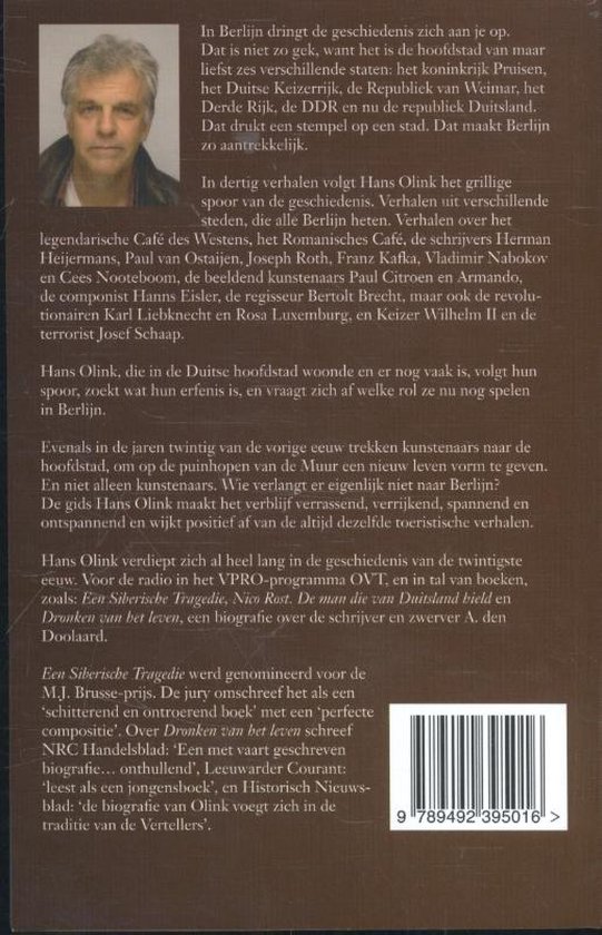 Hans Olink: Berlijn, Berlin. In het spoor van de geschiedenis In Berlijn dringt de geschiedenis zich aan je op. Dat is niet zo gek, want het is de hoofdstad van maar liefst zes verschillende staten: het koninkrijk Pruisen, het Duitse Keizerrijk, de Republiek van Weimar, het Derde Rijk, de DDR en nu de republiek Duitsland. Dat drukt een stempel op een stad. Dat maakt Berlijn zo aantrekkelijk. In dertig verhalen volgt Hans Olink het grillige spoor van de geschiedenis. Verhalen uit verschillende steden, die alle Berlijn heten. Verhalen over het legendarische Café des Westens, het Romanische Café, de schrijvers Herman Heijermans, Paul van Ostaijen, Joseph Roth, Franz Kafka, Vladimir Nabokov en Cees Nooteboom, de beeldend kunstenaars Paul Citroen en Armando, de componist Hanns Eisler, de regisseur Bertolt Brecht, maar ook de revolutionairen Karl Liebknecht en Rosa Luxemburg, en Keizer Wilhelm II en de terrorist Josef Schaap. Hans Olink, die in de Duitse hoofdstad woonde en er nog vaak is, volgt hun spoor, zoekt wat hun erfenis is, en vraagt zich af welke rol ze nu nog spelen in Berlijn. Evenals in de jaren twintig van de vorige eeuw trekken kunstenaars naar de hoofdstad, om op de puinhopen van de Muur een nieuw leven vorm te geven. En niet alleen kunstenaars. Wie verlangt er eigenlijk niet naar Berlijn? De gids Hans Olink maakt het verblijf verrassend, verrijkend, spannend en ontspannend en wijkt positief af van de altijd dezelfde toeristische verhalen. Hans Olink verdiept zich al heel lang in de geschiedenis van de twintigste eeuw. Voor de radio in het VPRO-programma OVT, en in tal van boeken, zoals: Een Siberische Tragedie, Nico Rost. De man die van Duitsland hield en Dronken van het leven, een biografie over de schrijver en zwerver A. den Doolaard. Een Siberische Tragedie werd genomineerd voor de M.J. Brusse-prijs. De jury omschreef het als een ‘schitterend en ontroerend boek’ met een ‘perfecte compositie’. Over Dronken van het leven schreef NRC Handelsblad: ‘Een met vaart geschreven biografie…onthullend’, Leeuwarder Courant: ‘leest als een jongensboek’, en Historisch Nieuwsblad: ‘de biografie van Olink voegt zich in de traditie van de Vertellers’.