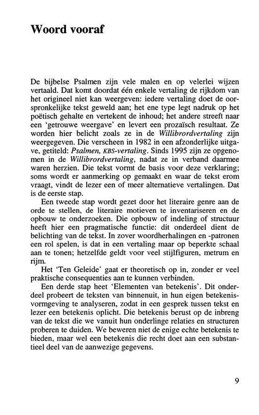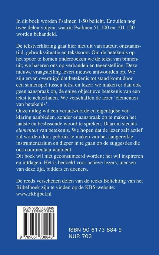 In dit boek worden Psalmen 1-50 belicht. Er zullen nog twee delen volgen, waarin Psalmen 51-100 en 101-150 worden behandeld. De tekstverklaring gaat hier niet uit van auteur, ontstaanstijd, gebruikssituatie en tekstsoort. Om de betekenis op het spoor te komen onderzoeken we de tekst van binnenuit; we baseren ons op verbanden en tegenstelling. Deze nieuwe vraagstelling levert nieuwe antwoorden op. We zijn ervan overtuigd dat betekenis tot stand komt door een samenspel tussen tekst en lezer; we maken er dan ook geen aanspraak op, de enige objectieve betekenis van een tekst te achterhalen. We verschaffen de lezer ‘elementen van betekenis’. Onze uitleg wil een verantwoorde en eigentijdse verklaring aanbieden, zonder er aanspraak op te maken het laatste en beslissende woord te spreken. Daarom slechts elementen van betekenis. We hopen dat de lezer zelf actief zal worden door gebruik te maken van het aangereikte instrumentarium en dieper in te gaan op de suggesties die ons commentaar aanbiedt. Dit boek wil niet geconsumeerd worden; het wil inspireren en uitdagen. Het is bedoeld voor actieve lezers, mensen van deze tijd, bidders en doeners. De reeds verschenen delen van de reeks Belichting van het Bijbelboek zijn te vinden op de KBS-website: www.rkbijbel.nl
