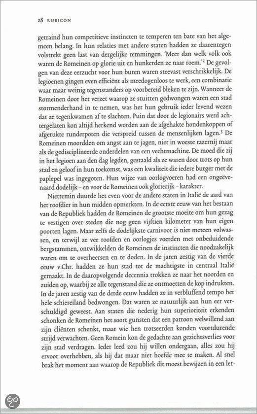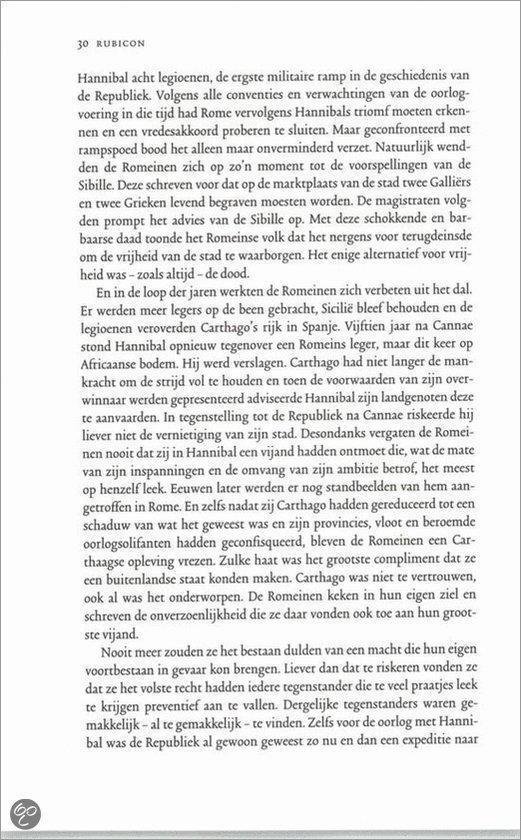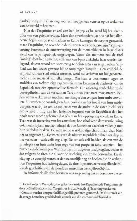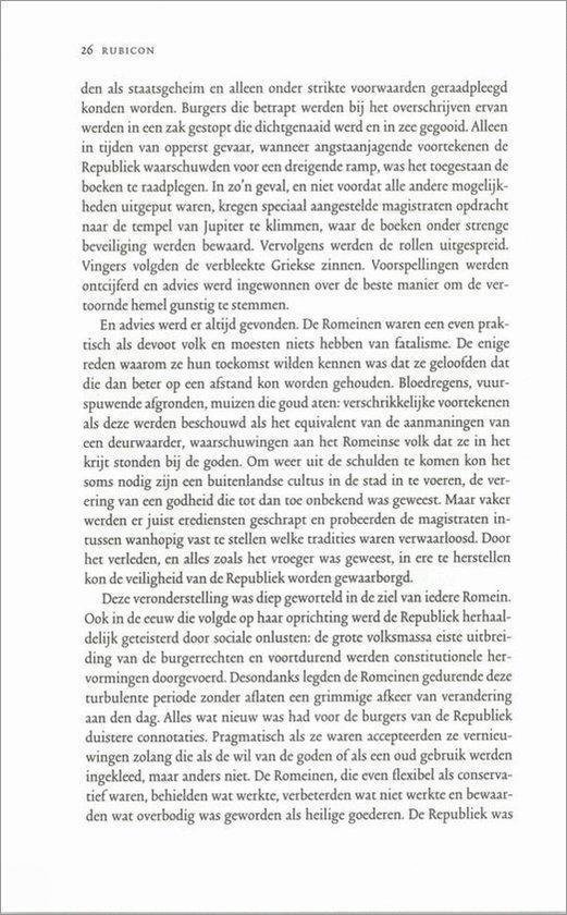 Rubicon is de meesterlijke, scherpzinnige,briljant geschreven en uitstekend gedocumenteerde geschiedenis van hoe een grootse beschaving van republiek tot keizerrijk werd.Een boek voor alle liefhebbers van spannende geschiedenis. Hollands boek leest als een roman en werd ogenblikkelijk een bestseller in Engeland, maar ook in vele andere landen.