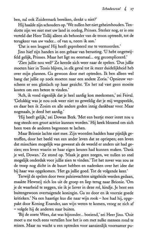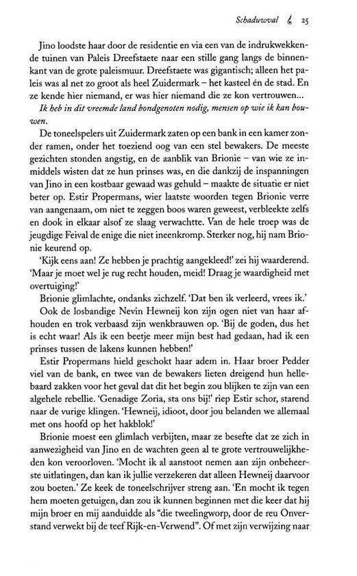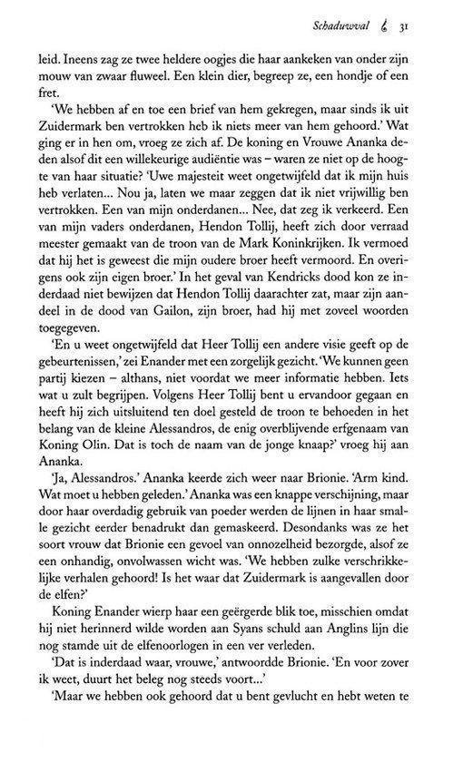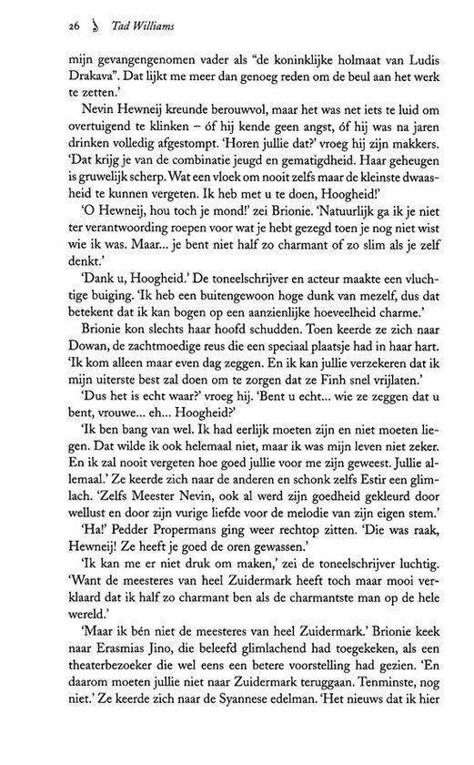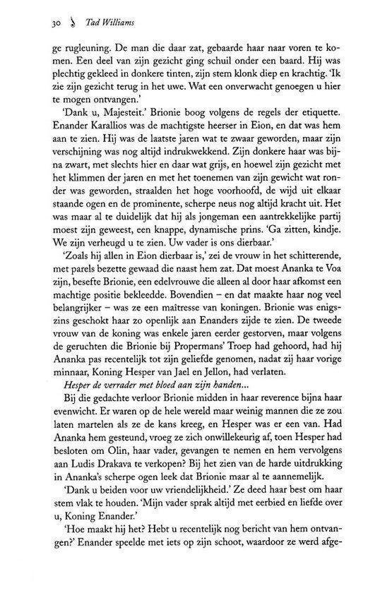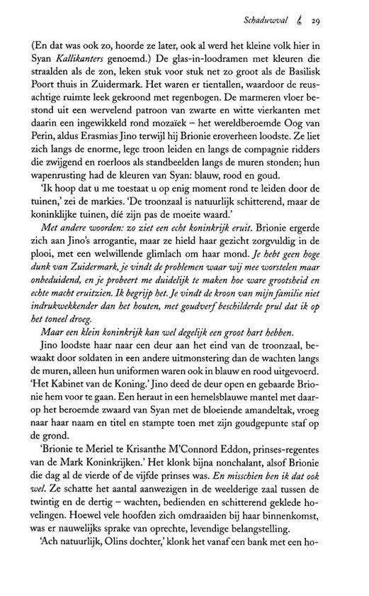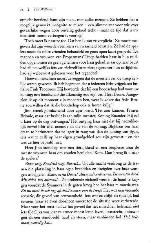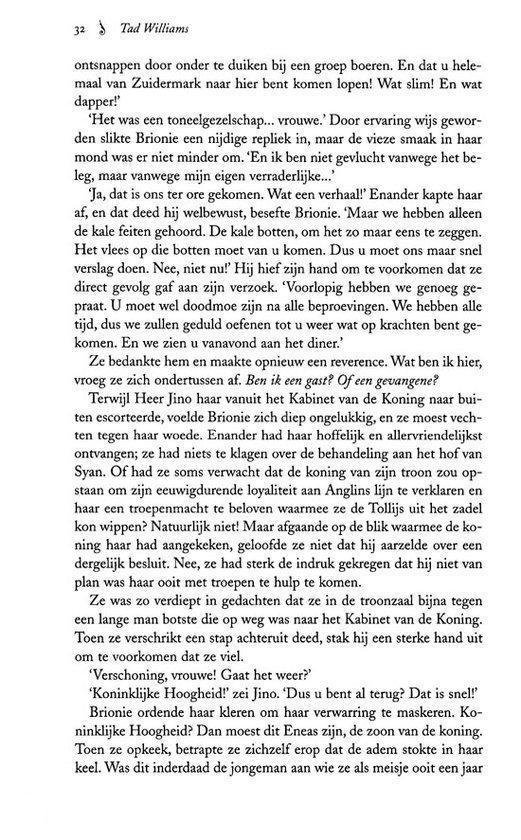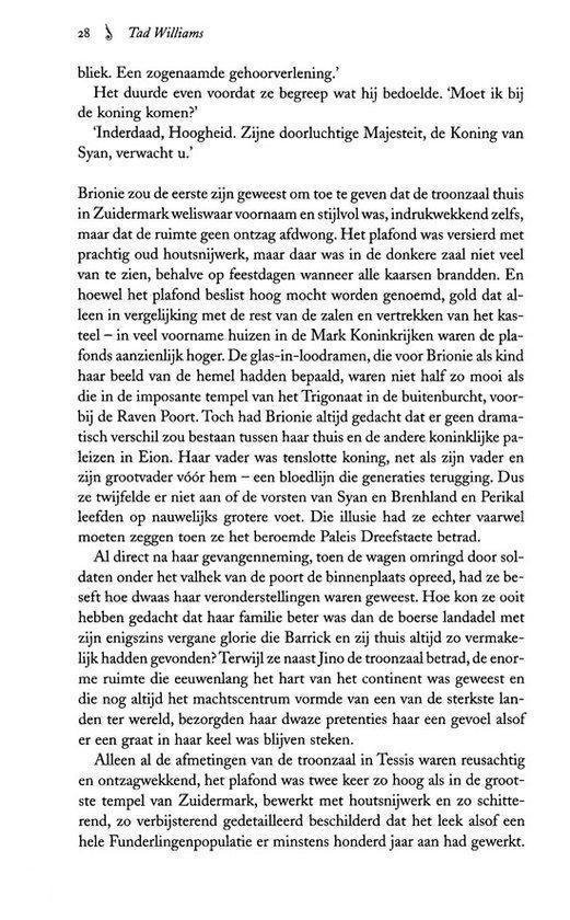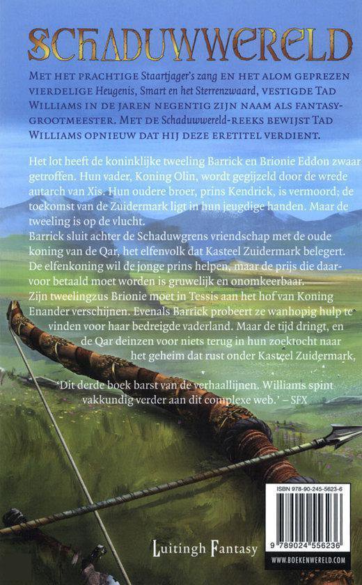 Met het prachtige Staartjager?s zang en het alom geprezen vierdelige Heugenis, Smart en het Sterrenzwaard, vestigde Tad Williams in de jaren negentig zijn naam als fantasy-grootmeester. Met de Schaduwwereld-reeks bewijst Tad Williams opnieuw dat hij deze eretitel verdient. Het lot heeft de koninklijke tweeling Barrick en Brionie Eddon zwaar getroffen. Hun vader, Koning Olin, wordt gegijzeld door de wrede autarch van Xis. Hun oudere broer, prins Kendrick, is vermoord, de toekomst van de Zuidermark ligt in hun jeugdige handen. Maar de tweeling is op de vlucht. Barrick sluit achter de Schaduwgrens vriendschap met de oude koning van de Qar, het elfenvolk dat Kasteel Zuidermark belegert. De elfenkoning wil de jonge prins helpen, maar de prijs die daarvoor betaald moet worden is gruwelijk en onomkeerbaar. Zijn tweelingzus Brionie moet in Tessis aan het hof van Koning Enander verschijnen. Evenals Barrick probeert ze wanhopig hulp te vinden voor haar bedreigde vaderland. Maar de tijd dringt, en de Qar deinzen voor niets terug in hun zoektocht naar het geheim dat rust onder Kasteel Zuidermark.