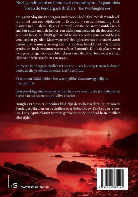 Scharlaken kust van Preston & Child is de vijftiende thriller in de serie over FBI-agent Aloysius Pendergast. Hier moet hij het opnemen tegen geesten uit het verleden. Pendergast accepteert een privéopdracht in Exmouth, Massachusetts om de diefstal van een waardevolle wijnkelder te onderzoeken. Samen met zijn pupil Constance Greene reist hij af naar de badplaats, waar ze al snel iets sinisters ontdekken: een dichtgemetselde nis in de wijnkelder die de resten van een man bevat, gemarteld en vervolgens levend begraven, 150 jaar geleden. Maar waarom? De puzzel wordt bemoeilijkt wanneer ze nog een lijk ontdekken – bedekt met mysterieuze symbolen – in de zoutmijnen achter Exmouth. De plaats waar, zo wil de legende, de echte heksen van Salem hun toevlucht zochten na de heksenjachten van 1692… Douglas Preston & Lincoln Child zijn de #1-bestsellerauteurs van de Pendergast-thrillers en de thrillers over Gideon Crew. De vloek van het oerwoud en De gruwelkamer worden gerekend tot de honderd beste thrillers aller tijden. ‘Superspannende thriller.’ De Telegraaf