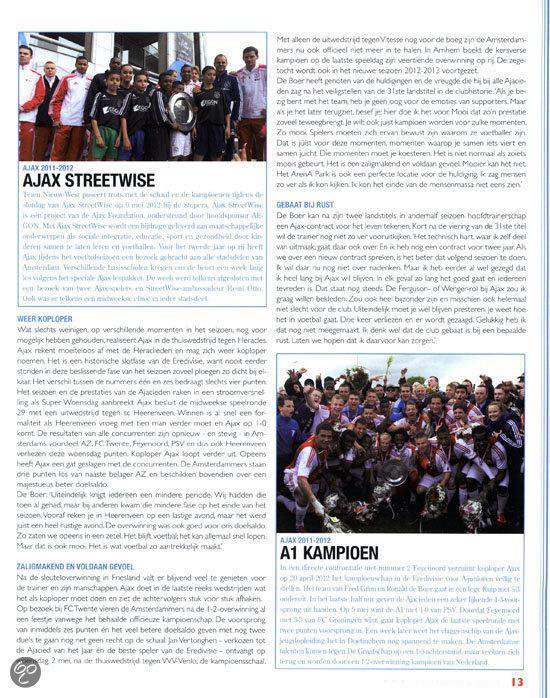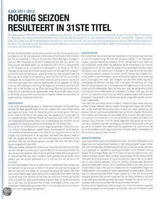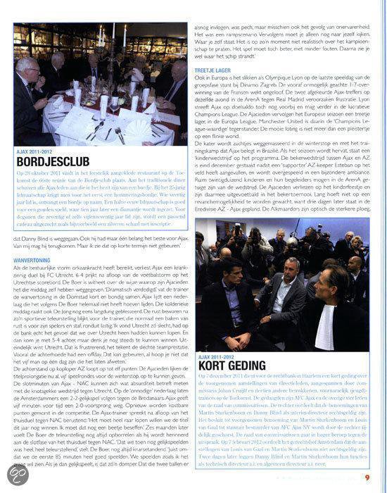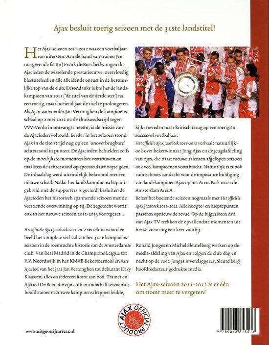 Het officiële Ajax Jaarboek 2011-2012 vertelt in woord en beeld het complete verhaal van het 31ste kampioensseizoen in de roemruchte historie van de Amsterdamse club. Van Real Madrid in de Champions League tot v.v. Noordwijk in het KNVB Bekertoernooi en van Ajacied van het Jaar Jan Vertonghen tot debutant Davy Klaassen; alles en iedereen komt aan bod. Trainer en Ajacied De Boer, die zijn club in anderhalf seizoen als hoofdtrainer naar twee kampioenschappen leidde, kijkt tevreden maar kritisch terug op een roerig én succesvol voetbaljaar.