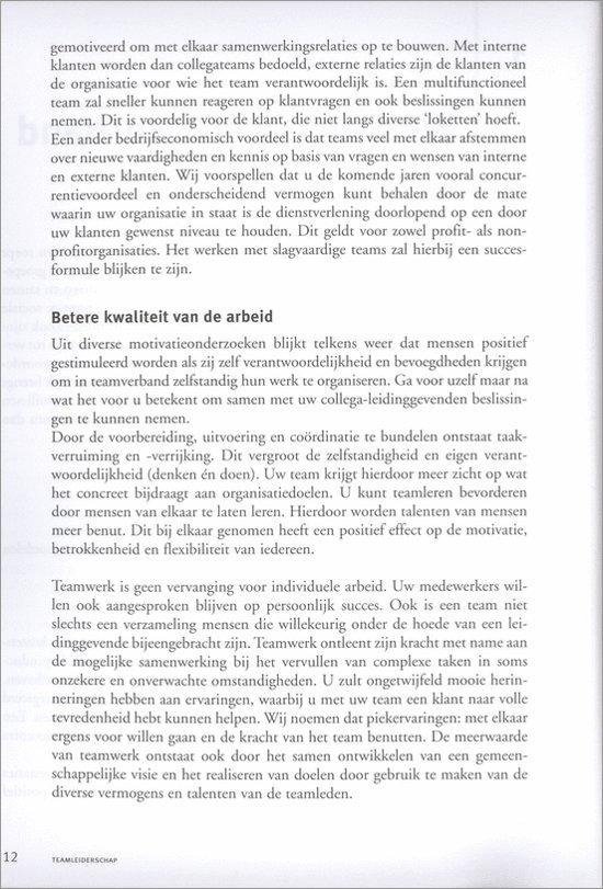 Teamleiderschap ondersteunt u bij uw professionaliseringsproces. De auteurs schrijven u niet voor hoe u het m et doen. Maar ze geven u tips en dagen u vooral uit om de praktische modellen over teammanagement en sociale vaardigheden om te zetten in praktisch dagelijks handelen. Met het toepassen van uw persoonlijke kwaliteiten als teamleider en de vele groeitips die dit boek u te bieden heeft, kunt u morgen al het verschil maken in het succesvol coachen van uw team.