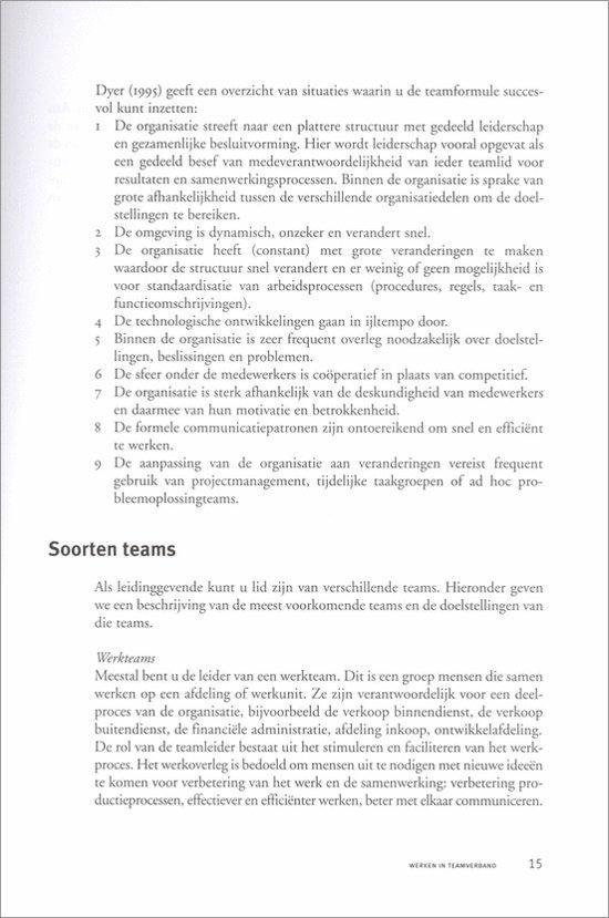 Een soepel draaiend team vraagt van u veel geduld, inzicht in de psy-chologische aspecten van mensen, en kennis van de dynamiek van teams. Daarvoor hebt u allerlei vaardigheden nodig, zoals het kunnen omgaan met conflicten. Verder werkt u met uw teamleden aan het ont-wikkelen van hun talenten, en u zet hun kwaliteiten op het juiste moment in. Ook moet u kunnen loslaten, delegeren en vertrouwen op de taakvolwassenheid van uw team. Dat betekent dat u kritisch naar uw eigen gedrag en verbetermogelijkheden kijkt en hierover feedback vraagt. Deze en andere aspecten komen in dit boek uitgebreid aan bod.