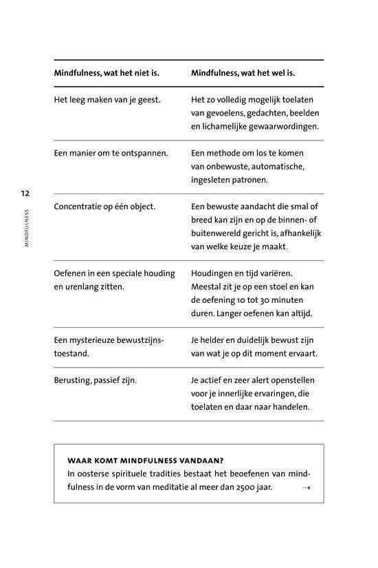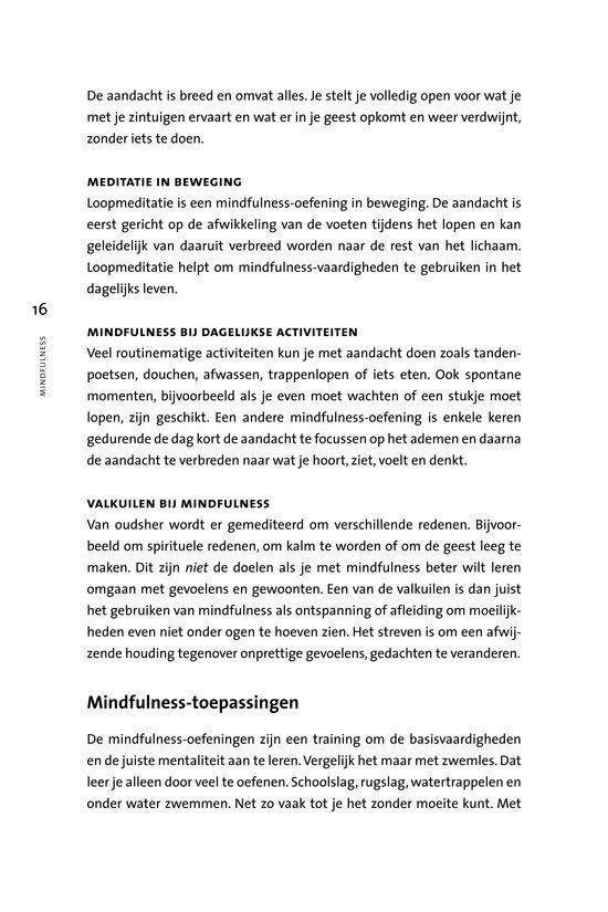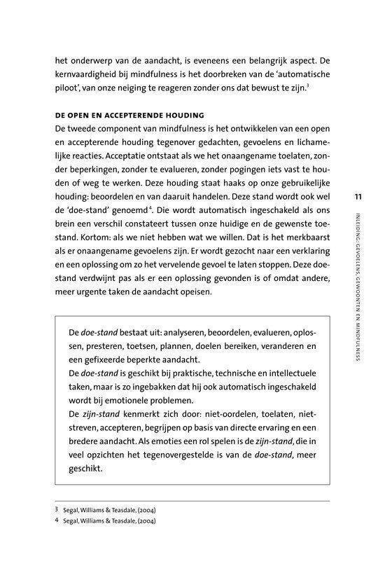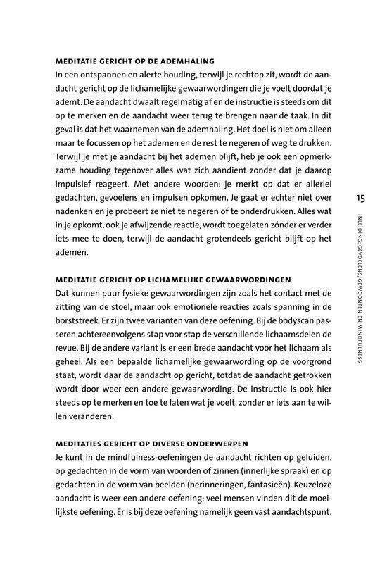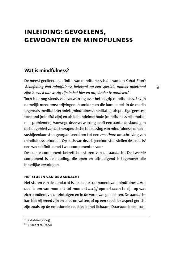 In onze drukke levens is er zo weinig tijd om even stil te staan bij jezelf, tijd om iets te doorleven, tijd om even pas op de plaats te maken. We staan voortdurend in een doe-stand en zijn steeds bezig iets voor elkaar te krijgen. Mindfulness leert je in de zijn-stand te komen en te blijven. Door een bewuste levenshouding laat je gevoelens, gedachten, beelden en lichamelijke gewaarwordingen toe en kom je los van onbewuste automatische patronen. Met de mindfulnessmeditaties uit dit pakket kun je die bewuste levenshouding trainen. Zo ontwikkel je inzicht, wijsheid en vooral belevingruimte. Het resultaat is dat je met volle aandacht in het hier en nu leeft, met een open blik. Dit boek en de meditatieoefeningen leren je stap voor stap de belangrijkste technieken uit de mindfulness. Zo krijg je meer greep op ingesleten gewoontepatronen. Naast een zelfwerkboek is deze set ook een uitstekend hulpmiddel bij (psychol)therapie, training of een coachingstraject. Mindfulness, wat het wel is Al je gevoelens, gedachten, beelden en lichamelijke gewaarwordingen toelaten Loskomen van onderbewuste automatisch ingesleten patronen Bewuste aandacht en focus Zo volledig mogelijk in contact zijn met jezelf Je helder en duidelijk bewust zijn van wat je nu ervaart Je actief en zeer alert openstellen Mindfulness, wat het niet is Je geest leegmaken Een manier om te ontspannen Op één object concentreren Urenlang in een speciale houding zitten Een mysterieuze bewustzijnstoestand Berusting en passief zijn