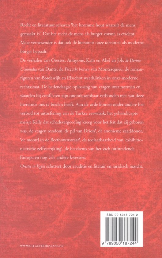 De verhalen van Orestes, Antigone, Kaïn en Abel en Job, de Divina Commedia van Dante, de Perzische brieven van Montesquieu, de romanfiguren van Bordewijk en Elsschot weerklinken in onze moderne rechtsstaat. De hedendaagse oplossing van vragen over normen en waarden bij conflicten zijn onontkoombaar verbonden met wat deze literatuur ons te bieden heeft.