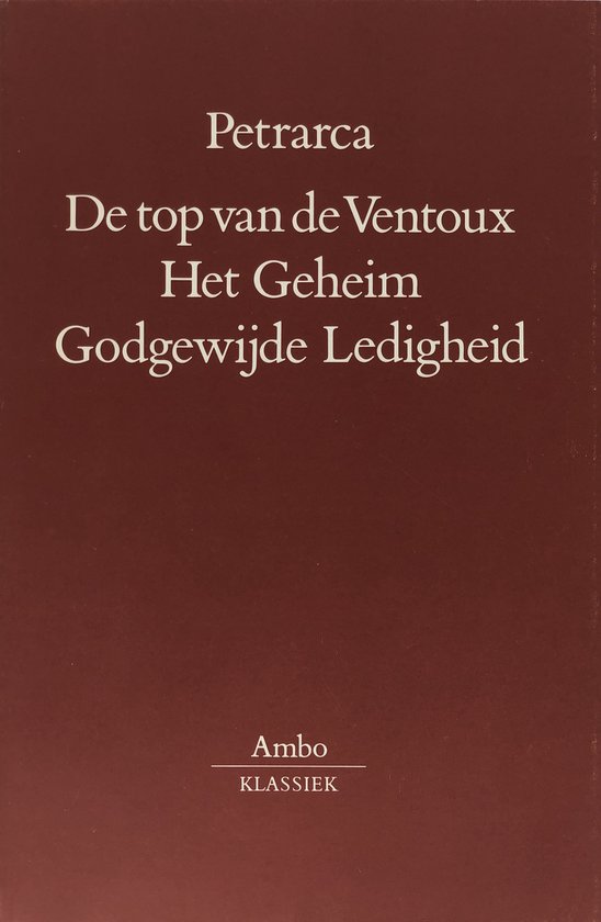 In De top van de Ventoux beschrijft Petrarca in briefvorm hoe hij de Mont Ventoux beklimt, zogenaamd om van het uitzicht te genieten. De tocht wordt echter een allegorie voor de menselijke levensweg: terwijl hij omhooggaat, beseft hij dat de ware klim niet de berg betreft maar de innerlijke reis naar morele verheffing en geestelijke zuivering. Het slot, waarin hij spontaan een passage van Augustinus leest, benadrukt dat de ware grootheid niet ligt in uiterlijke natuurervaring maar in de omkeer naar God en innerlijke reflectie. Het geheim (Secretum) is een denkbeeldige dialoog tussen Petrarca en Augustinus, met Vrouwe Waarheid als getuige. In dit werk onderzoekt hij zijn eigen ziel, zijn gehechtheid aan roem en liefde, en de strijd tussen aardse verlangens en spirituele plicht. Het is een intieme en kritische zelfondervraging, waarin Petrarca zijn zwakheden niet verhult maar probeert ze onder leiding van Augustinus te begrijpen en te overwinnen. In Godgewijde ledigheid (De otio religioso) prijst Petrarca het monastieke leven als een vorm van heilige rust. In tegenstelling tot de drukte van de wereld, biedt de kloostereenzaamheid de ruimte voor studie, gebed en contemplatie. Hier klinkt Petrarca’s ambivalente houding door: enerzijds voelt hij zich aangetrokken tot een actieve, wereldse rol als dichter en humanist, anderzijds bewondert hij de stilte en toewijding van het klooster. Samen vormen deze teksten een spiegel van Petrarca’s innerlijke zoektocht naar de juiste verhouding tussen wereld en geest, actie en contemplatie.