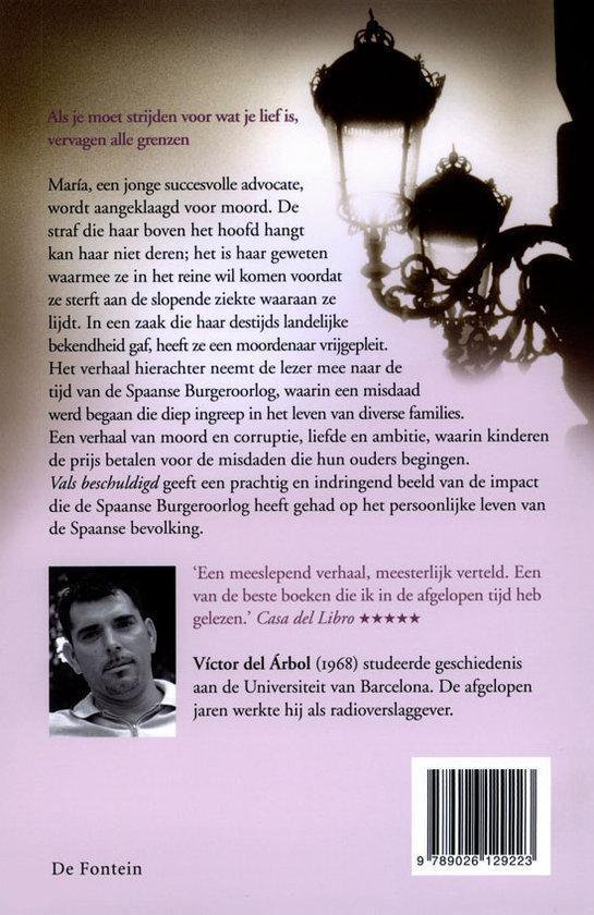 Als je moet strijden voor wat je lief is, vervagen alle grenzen María, een jonge succesvolle advocate, wordt aangeklaagd voor moord. De straf die haar boven het hoofd hangt kan haar niet deren; het is haar geweten waarmee ze in het reine wil komen voordat ze sterft aan de slopende ziekte waaraan ze lijdt. In een zaak die haar destijds landelijke bekendheid gaf, heeft ze een moordenaar vrijgepleit. Het verhaal hierachter neemt de lezer mee naar de tijd van de Spaanse Burgeroorlog, waarin een misdaad werd begaan die diep ingreep in het leven van diverse families. Een verhaal van moord en corruptie, liefde en ambitie waarin kinderen de prijs betalen voor de misdaden die hun ouders begingen. Vals beschuldigd geeft een prachtig en indringend beeld van de gevolgen die de Spaanse Burgeroorlog heeft gehad op het persoonlijke leven van de Spaanse bevolking.