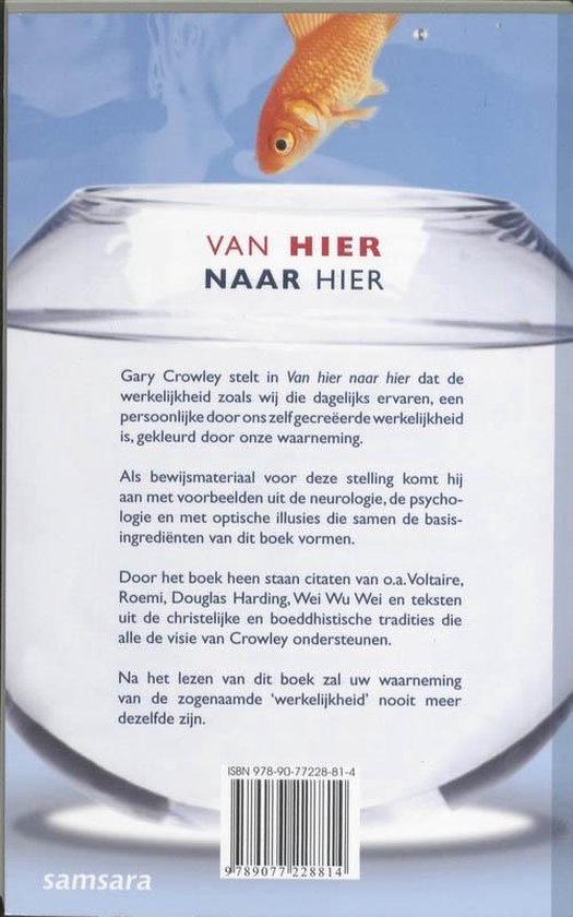 Gary Crowley stelt in Van hier naar hier dat de werkelijkheid zoals wij die dagelijks ervaren, een persoonlijke door ons zelf gecreëerde werkelijkheid is, gekleurd door onze waarneming. Als bewijsmateriaal voor deze stelling komt hij aan met voorbeelden uit de neurologie, de psychologie en met optische illusies die samen de basisingrediënten van dit boek vormen. Door het boek heen staan citaten van o.a. Voltaire, Roemi, Douglas Harding, Wei Wu Wei en teksten uit de christelijke en boeddhistische tradities die alle de visie van Crowley ondersteunen. Na het lezen van dit boek zal uw waarneming van de zogenaamde ‘werkelijkheid’ nooit meer dezelfde zijn.