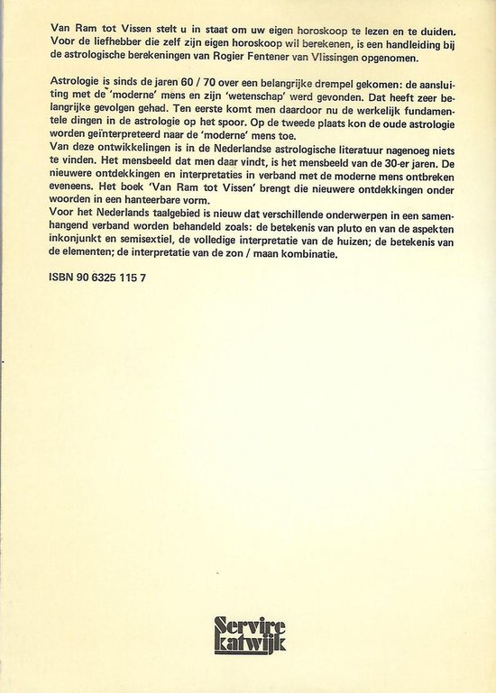 Van deze ontwikkelingen is in de Nederlandse astroplogische literatuur nagenoeg niets te vinden. Het mensbeeld at men daar vindt, is het mensbeeld van de 30-er jaren. De nieuwere ontdekkingen en ingterpretaties in verband met de moderne mens ontbreken eveneens. Het boek ‘Vab Ram tot Vissen’ brengt die nieuwere ontdekkingen onder woorden in een hanteerbare vorm.