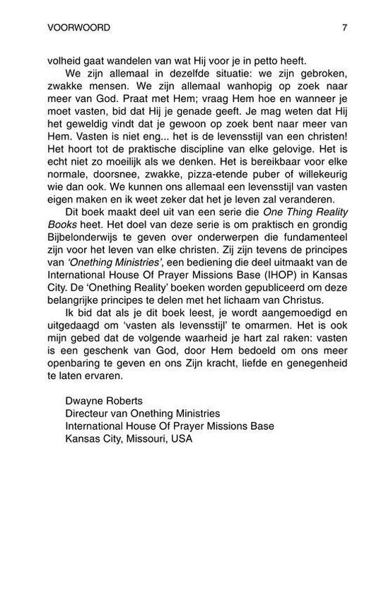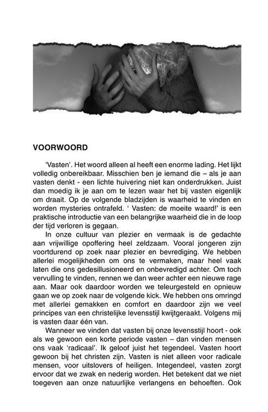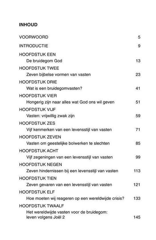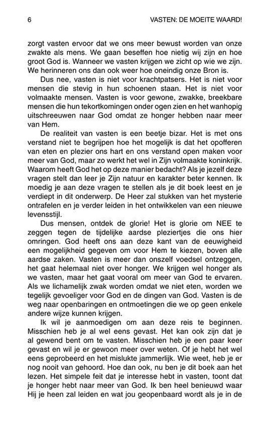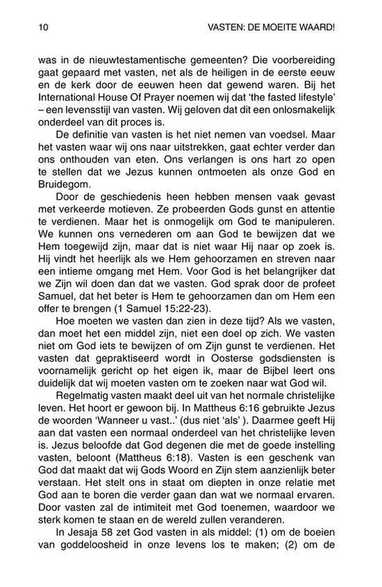 Vasten. Dat klinkt moeilijk. Elke week vasten? Dat is onmogelijk! Onze samenleving beschouwt honger als iets verschrikkelijks, maar God noemt honger door vasten een deel van het normale christelijke leven. Honger naar God kent iedereen die van Jezus houdt – een pijn van binnen die ons vaak wanhopig maakt. Wat nieuw voor sommigen is, is dat vasten een manier is die God gekozen heeft om onze honger naar Hem te beantwoorden en om Hem meer te ervaren. Vasten is noodzakelijk omdat het onze roep naar meer van God beantwoordt. God nodigt ons uit om te vasten. Om hierop met een volmondig ‘ja’ te kunnen reageren, moeten we eerst de geheimen van het vasten ontdekken. Vasten verdiept onze ervaring en kennis van God’s hart, vergroot ons vermogen om Jezus te zien als onze Bruidegom, en rust ons toe om te kunnen wandelen in de kracht van de Heilige Geest in deze moeilijke tijd waarin we leven. Vasten is een vorm van leeg worden van onszelf om ons te kunnen laten vullen met wie God is. Vasten is niet iets dat we kunnen verwaarlozen of vermijden – het is iets dat we met ons hele hart zouden moeten omarmen.