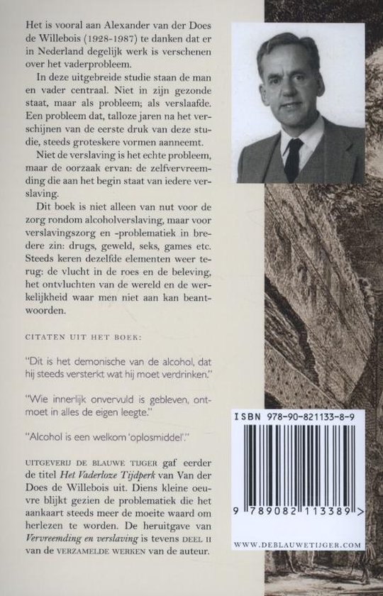 In deze uitgebreide studie staan de man en vader centraal. Niet in zijn gezonde staat, maar als probleem; als verslaafde. Een probleem dat, talloze jaren na het verschijnen van de eerste druk van deze studie, steeds groteskere vormen aanneemt. Niet de verslaving is het werkelijke probleem, maar de oorzaak ervan: de zelfvervreemding die aan het begin staat van iedere verslaving. Dit boek is niet alleen van nut voor de zorg rondom alcoholverslaving, maar voor verslavingszorg en -problematiek in bredere zin: drugs, geweld, seks, games etc. Steeds keren dezelfde elementen weer terug: de vlucht in de roes en de beleving, het ontvluchten van de wereld en de werkelijkheid waar men niet aan kan beantwoorden. citaten uit het boek: “Dit is het demonische van de alcohol, dat hij steeds versterkt wat hij moet verdrinken.” “Wie innerlijk onvervuld is gebleven, ontmoet in alles de eigen leegte.” “Alcohol is een welkom ‘oplosmiddel’.” Uitgeverij de Blauwe Tijger gaf eerder de titel Het Vaderloze Tijdperk van Van der Does de Willebois uit. Diens kleine oeuvre blijkt gezien de problematiek die het aankaart steeds meer de moeite waard om herlezen te worden. De heruitgave van Vervreemding en verslaving is tevens deel II van de verzamelde werken van de auteur.