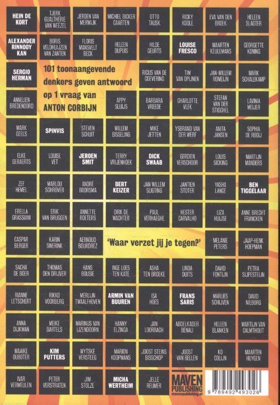 ‘Waar verzet jij je tegen?’ is de vierde editie in de succesvolle reeks Nederland in ideeën, waarin toonaangevende wetenschappers, ondernemers en kunstenaars antwoord geven op één vraag. Dit jaar werd de vraag gesteld door Anton Corbijn: ‘Waar verzet jij je tegen?’