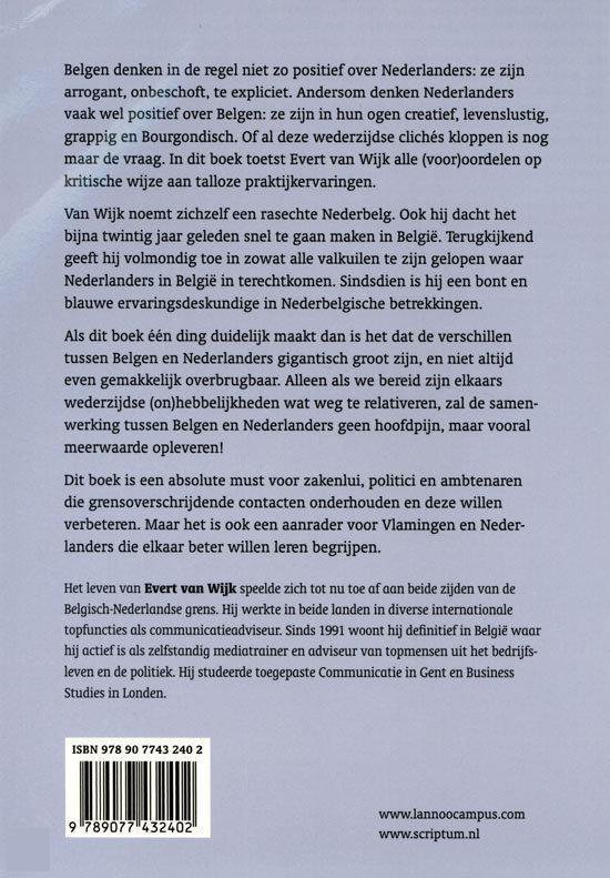 Belgen denken in de regel niet zo positief over Nederlanders: ze zijn arrogant, onbeschoft, te expliciet. Andersom denken Nederlanders vaak wel positief over Belgen: ze zijn in hun ogen creatief, levenslustig, grappig en Bourgondisch. Of al deze wederzijdse clichés kloppen is nog maar de vraag. In dit boek toetst Evert van Wijk alle (voor)oordelen op kritische wijze aan talloze praktijkervaringen. Van Wijk noemt zichzelf een rasechte Nederbelg. Ook hij dacht het bijna 20 jaar geleden snel te gaan maken in België . Terugkijkend geeft hij volmondig toe in zowat alle valkuilen te zijn gelopen waar Nederlanders in België in terechtkomen. Sindsdien is hij een bont en blauwe ervaringsdeskundige in Nederbelgische betrekkingen. Als dit boek één ding duidelijk maakt dan is het dat de verschillen tussen Belgen en Nederlanders gigantisch groot zijn, en niet altijd even gemakkelijk overbrugbaar. Alleen als we bereid zijn elkaars wederzijdse (on)hebbelijkheden wat weg te relativeren, zal de samenwerking tussen Belgen en Nederlanders geen hoofdpijn, maar vooral meerwaarde opleveren! Dit boek is een absolute must voor zakenlui, politici en ambtenaren die grensoverschrijdende contacten onderhouden en die willen verbeteren. Maar het is ook een aanrader voor Vlamingen en Nederlanders die elkaar beter willen leren begrijpen.
