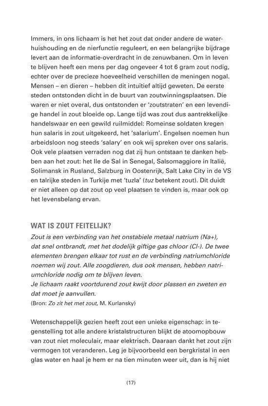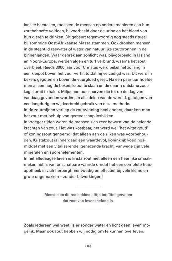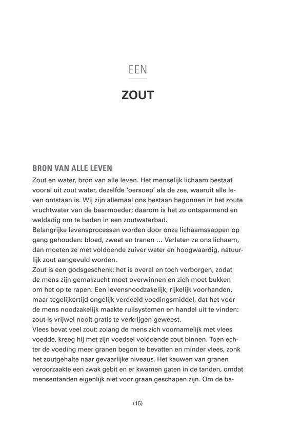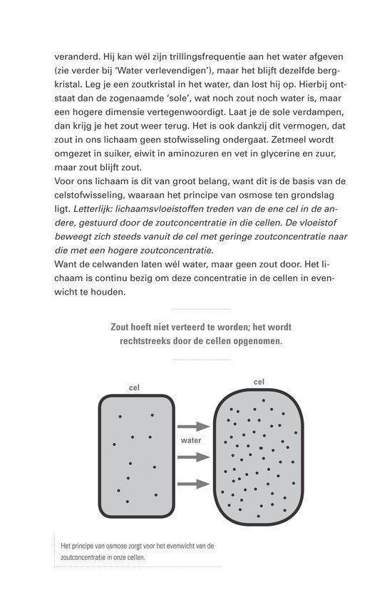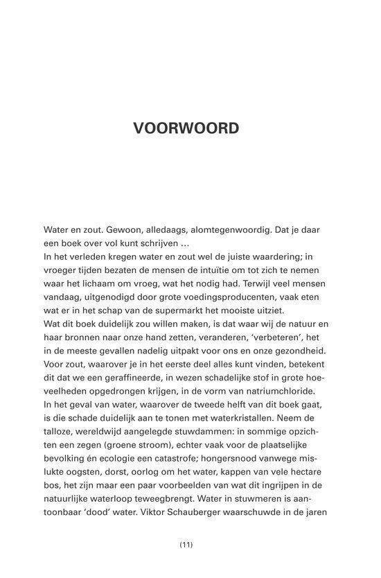 In Water en zout beschrijft Josephine van Rossum hoe water en zout volgens haar de basis vormen van gezondheid en vitaliteit. Ze maakt onderscheid tussen “gewoon” tafelzout (natriumchloride) en natuurlijk, ongeraffineerd (kristal)zout, en stelt dat de keuze van zout én de kwaliteit van water invloed hebben op het lichaam. Het boek is praktisch opgezet: naast uitleg over achterliggende ideeën bevat het veel eenvoudige doe-het-zelftoepassingen die je thuis kunt uitvoeren. Denk aan verzorgings- en wellnessrecepten met zout en water, zoals scrubs/peelings, bad- en kompresachtige toepassingen en andere huis-tuin-en-keukenrituelen voor huid en lichaam. De toon is toegankelijk en gericht op mensen die een meer “natuurlijke” leefstijl nastreven en zelf aan de slag willen met basisingrediënten. Het is daarmee minder een wetenschappelijk handboek en meer een praktische gids met tips, achtergrond en recepten rondom dagelijks gebruik van water en zout.