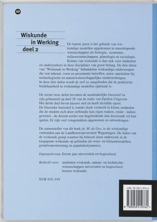 Wiskunde in Werking 3 van Maarten de Gee is het derde deel in een serie die wiskundige technieken koppelt aan praktische toepassingen in de wetenschappen. Dit deel richt zich op functies van meerdere variabelen en behandelt onderwerpen zoals differentiaalvergelijkingen, integratie in meerdere dimensies, partiële differentiaalvergelijkingen, en vectorvelden. Het boek is bedoeld voor studenten in technische en natuurwetenschappelijke richtingen en biedt een gestructureerde aanpak met veel oefeningen en uitwerkingen. De opbouw van het boek volgt een vast patroon: elk hoofdstuk begint met een inleiding die de relevantie van het onderwerp uitlegt, gevolgd door wiskundige theorie, toepassingen en opgaven. Aan het einde van elk hoofdstuk wordt de behandelde stof in een breder perspectief geplaatst. Deze aanpak bevordert zowel het begrip van de theorie als het vermogen om deze toe te passen op praktische vraagstukken. Wiskunde in Werking 3 is een waardevolle bron voor studenten die hun wiskundige kennis willen verdiepen en toepassen in hun vakgebied. Het boek is verkrijgbaar bij onder andere Bol.com en Epsilon Uitgaven, met een prijs van €39,50. Voor actuele beschikbaarheid en prijzen kunt u de genoemde websites raadplegen.