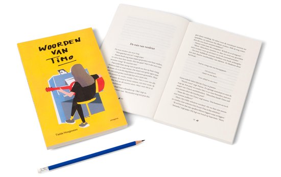 Als Nanne het vreselijke bericht krijgt dat haar broer Timo is verongelukt, verdwijnt in één klap alle kleur uit haar leven. Nanne weet niet eens meer hoe dat gaat: leven. Mag je nog wel lachen of verliefd worden als je broer dood is? En kan ze nu wel vmbo-examen doen? Maar soms als Nanne muziek maakt, is Timo weer even bij haar. Zijn notitieblokken met teksten inspireren haar om zelf ook songs te schrijven. Misschien kan ze haar verdriet in woorden kwijt, zodat ze weer vooruit kan kijken… ‘Woorden van Timo’ van Tialda Hoogeveen is een aangrijpend boek over rouw en vriendschap, op de tonen van muziek en songteksten.