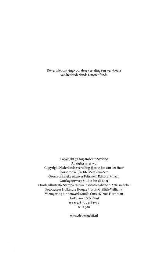 Zero Zero Zero brengt alle aspecten van de internationale cocaïnehandel in kaart: van het ontstaan van de drugshandelnetwerken tot en met de manier waarop de handel onontbeerlijk is geworden voor de wereldeconomie. Roberto Saviano volgt de cocaïne van Zuid-Amerika tot de stranden van Miami, de straten van New York, tot in Afrika, Europa, China en India. Hij volgt gebruikers, slachtoffers, dealers en daders. Zero Zero Zero leest als een thriller maar berust volstrekt op waarheid. Het toont hoe de wereldwijde verkoop en consumptie van cocaïne de afgelopen decennia zowel de zwarte markt als de legale economie hebben veranderd en van diepgaande invloed zijn op samenlevingen en mensen overal ter wereld.
