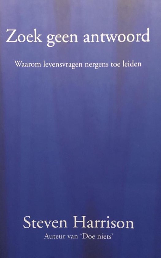 Zoek geen antwoord van Steven Harrison is een filosofisch-spiritueel werk dat de menselijke neiging om antwoorden te zoeken op existentiële vragen fundamenteel ter discussie stelt. In plaats van nieuwe inzichten of technieken aan te reiken, onderzoekt Harrison het mechanisme achter het zoeken zelf. Hij betoogt dat de drang naar oplossingen, verklaringen en spirituele vooruitgang voortkomt uit een diepgewortelde identificatie met het denken.Het boek is opgebouwd in een vraag-en-antwoordstructuur waarin veelvoorkomende levensvragen over identiteit, vrijheid, lijden en verlichting worden ontleed. Harrison laat zien hoe zowel religieuze systemen als moderne vormen van therapie en zelfontwikkeling vaak dezelfde structuur volgen: ze beloven verandering of verbetering van het ‘zelf’. Volgens de auteur is dit echter een misverstand, omdat het zelfbeeld dat men probeert te verbeteren een constructie van gedachten is.De kern van het boek ligt in het inzicht dat wezenlijke helderheid niet ontstaat door nieuwe overtuigingen of methoden, maar door het doorzien van de illusie dat er iets bereikt moet worden. Het loslaten van de zoektocht zelf opent volgens Harrison de mogelijkheid van directe, ongeconditioneerde ervaring.