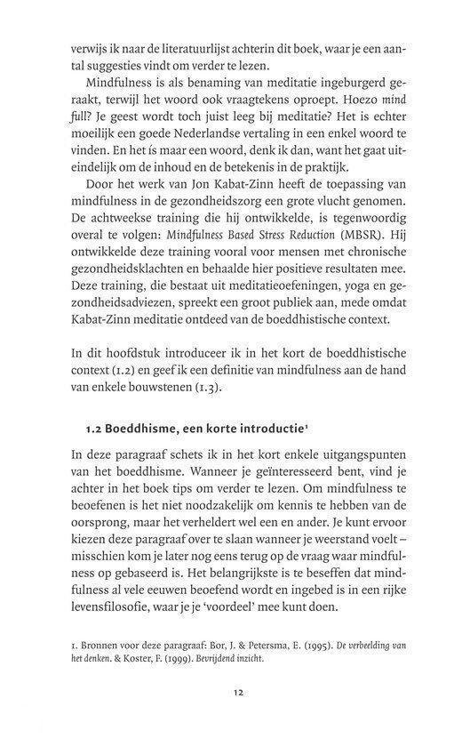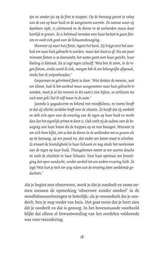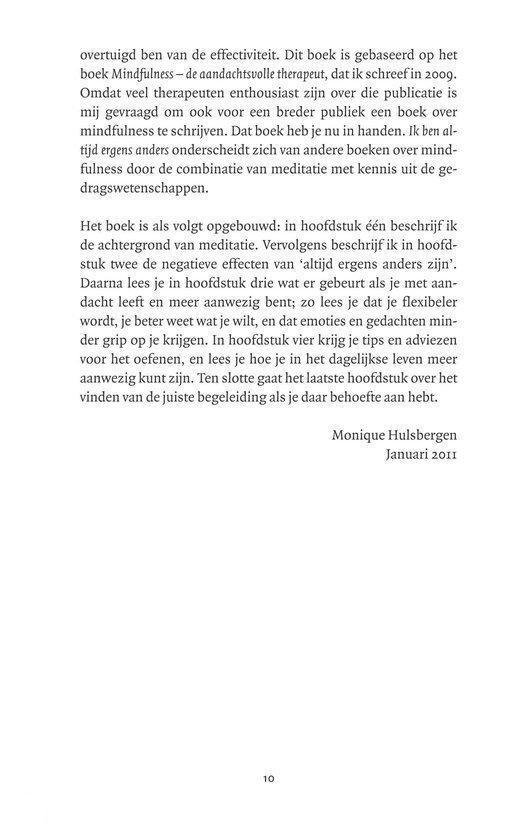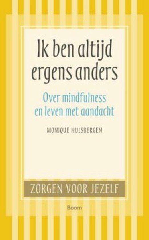 Ik ben altijd ergens anders Over mindfulness en leven met aandacht Monique Hulsbergen Ben jij ook altijd bezig met morgen of met gisteren? Zo verblijf je urenlang ergens anders, zonder dat je het in de gaten hebt. Je wordt bang voor iets wat zou kunnen gebeuren of somber over iets wat allang voorbij is. Het kan ook zijn dat je nastreeft dat morgen alles anders wordt: dat je meer geld hebt, of meer vrije tijd, een leukere partner vindt of meer aanzien krijgt. In dit boek wordt beschreven hoe je deze denkpatronen doorbreekt door te leven met aandacht. Er wordt gebruik-gemaakt van mindfulnessoefeningen die eeuwenoud zijn, en al tientallen jaren met succes worden toegepast in de gezondheidszorg en het bedrijfsleven. Na het lezen van dit boek lukt het je om steeds vaker aanwezig te zijn: in het hier en nu. Dit boek verschijnt in de serie Zorgen voor jezelf. Over de auteur(s): Monique Hulsbergen werkte achttien jaar als gz-psycholoog/psychotherapeut in de geestelijke gezondheidszorg, de laatste jaren in eigen praktijk. Op dit moment geeft zij trainingen en nascholing op het gebied van mindfulness. Tevens werkt zij als copywriter en stemacteur. Eerder schreef zij Mindfulness Β De aandachtsvolle therapeut (2009) en het Boom Hulpboek Voluit Leven(2009).
